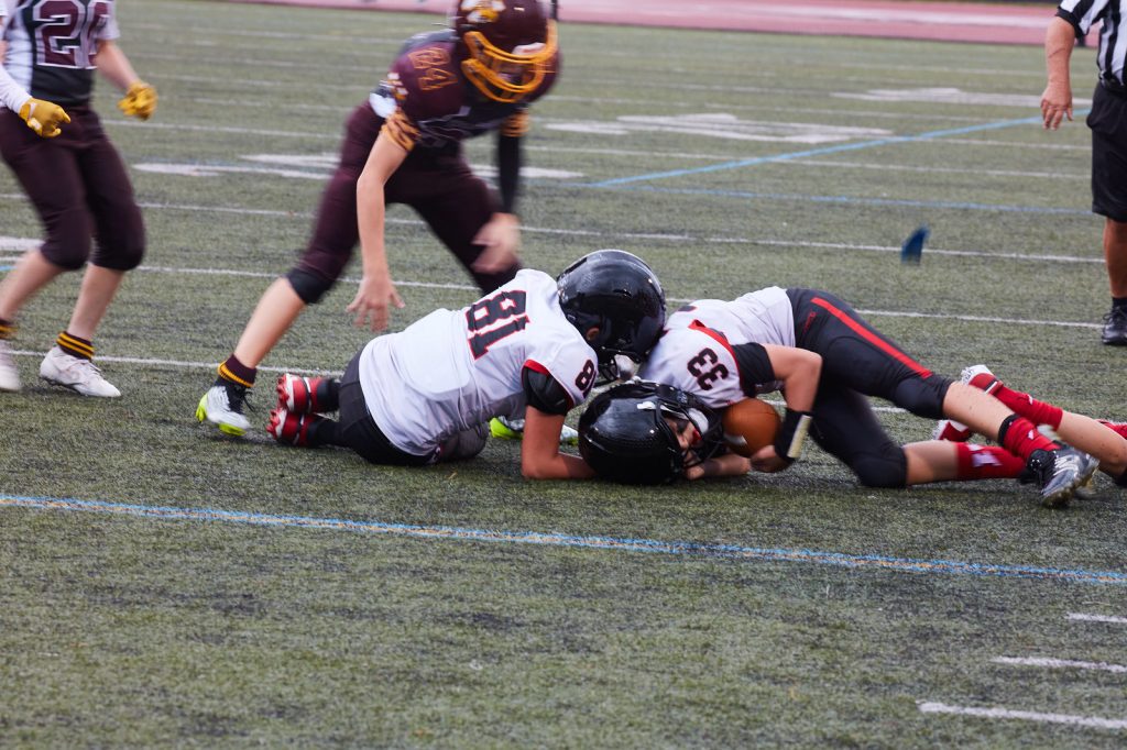 On paper Weymouth was bigger with an imposing running game, but the front line of Duncan Wilder, Shamus Devine, Costello, Berkeley and Brayden Huber stuffed the run and enabled LB’s John Peterson, Andy Gerlach and Daniel Lovendale to make key tackles to force a 4th and long. Duncan Wilder pressured the QB forcing him to throw an interception caught by Hudson Garrity at the 45 yard line. Quickly capitalizing on the turnover, QB Garrity followed the blocks from Ryan Crespi and Shamus Devine bursting upfield for a 45 yard TD run to take a 12-0 lead. The defense had a pack mentality with Peterson, Berkeley, Cam Forger and Lovendale shutting down the run as Jack Hart stripped the ball from the running back which Ryan Crespi and Mason Aframe alertly dove on for the recovery at the 42 yard line.
