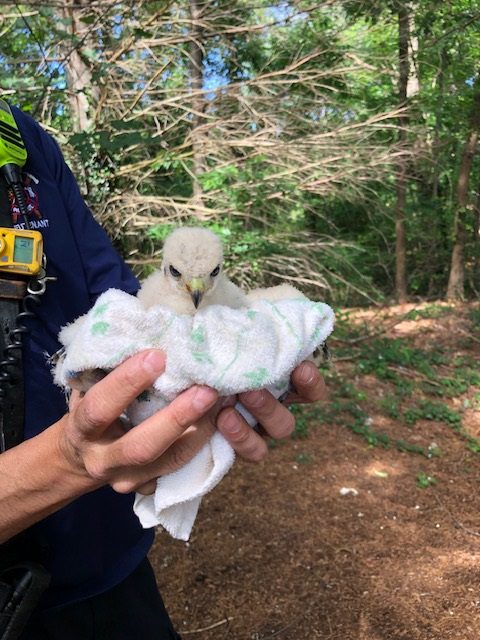 In the early afternoon Pat from Arborscape was mowing below Unit 1 and saw something white in the grass. It turned out to be a baby hawk that had fallen out of a nest high up in a nearby pine. Pat called animal control who responded and determined the fledgling was not injured, just misplaced. Below is the little fellow carefully wrapped in a cloth being held by one of the firemen. The mom was flying around, unhappy with all the goings on.