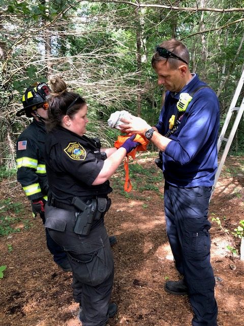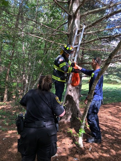 Those of you who were around this afternoon probably wondered what the fire engine was doing down by the entrance. You may have also noticed the Hingham animal control officer’s car as well. Thankfully, no residents were in need of fire support, but one of our local “children” needed help.