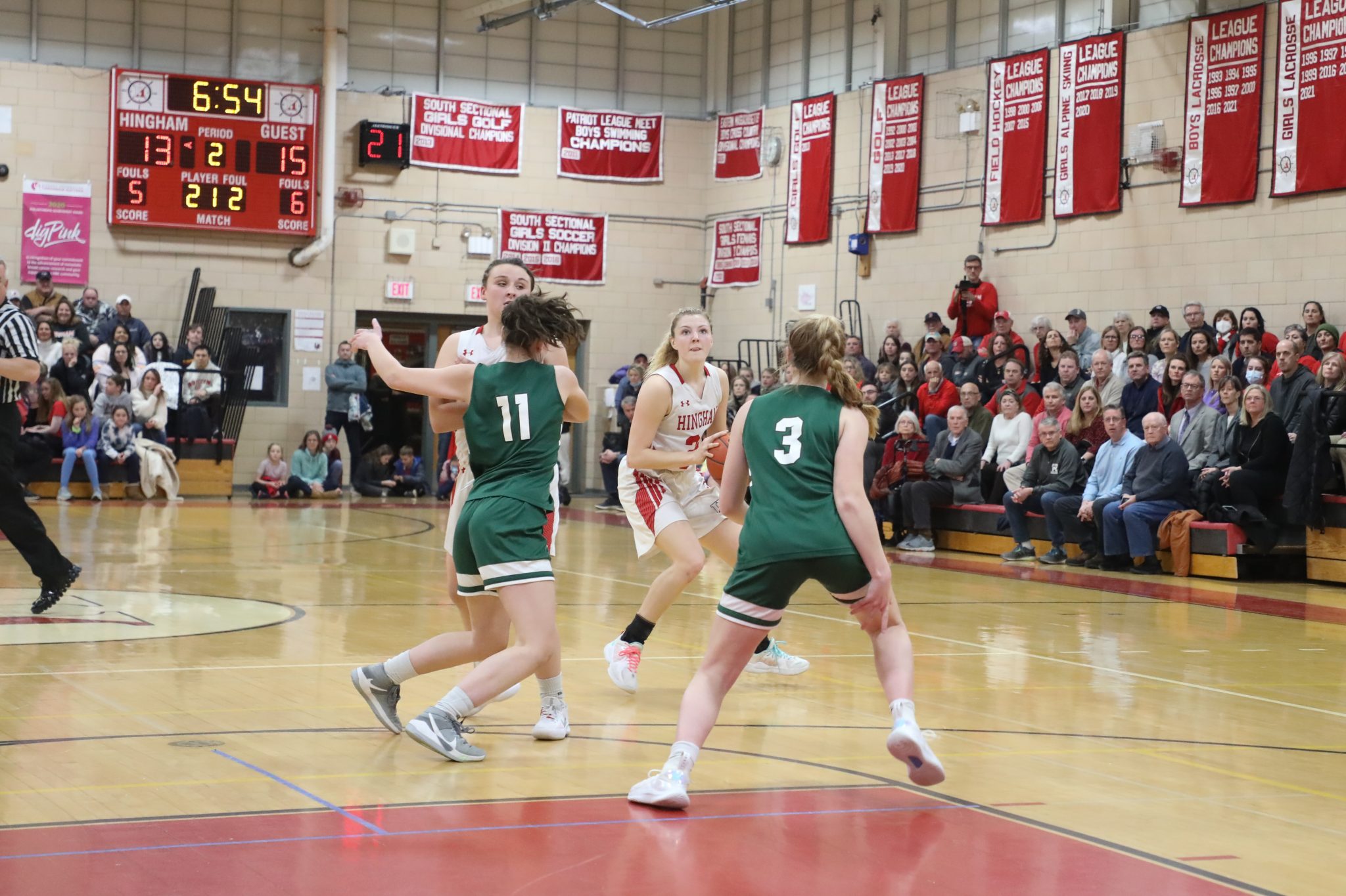 The moment seemed to jump start her teammates as the game got off to a slow start. In their third meeting in two weeks, both teams seemed to have some playoff nerves in the first quarter. Junior Sarah Holler single-handedly kept her team in it the first quarter with her hustle and the fact she grabbed every available rebound. Once Blasetti scored the three to give her team the lead, the nerves settled and they began to play their game. They aggressively drove to the basket and dove for every loose ball causing Marshfield’s top players to get in early foul trouble. It was close throughout the game until junior captain Colette Hanney drained a three pointer as time expired in the third quarter extending the Harborwomen’s lead to 40-35, topping off a 7-0 run to end the quarter. Hingham locked it down in the fourth quarter only giving up four points to the Rams. The Harborwomen outscored Marshfield 25-5 to close out the game and secure them a spot in the round of 16 vs Springfield Central.