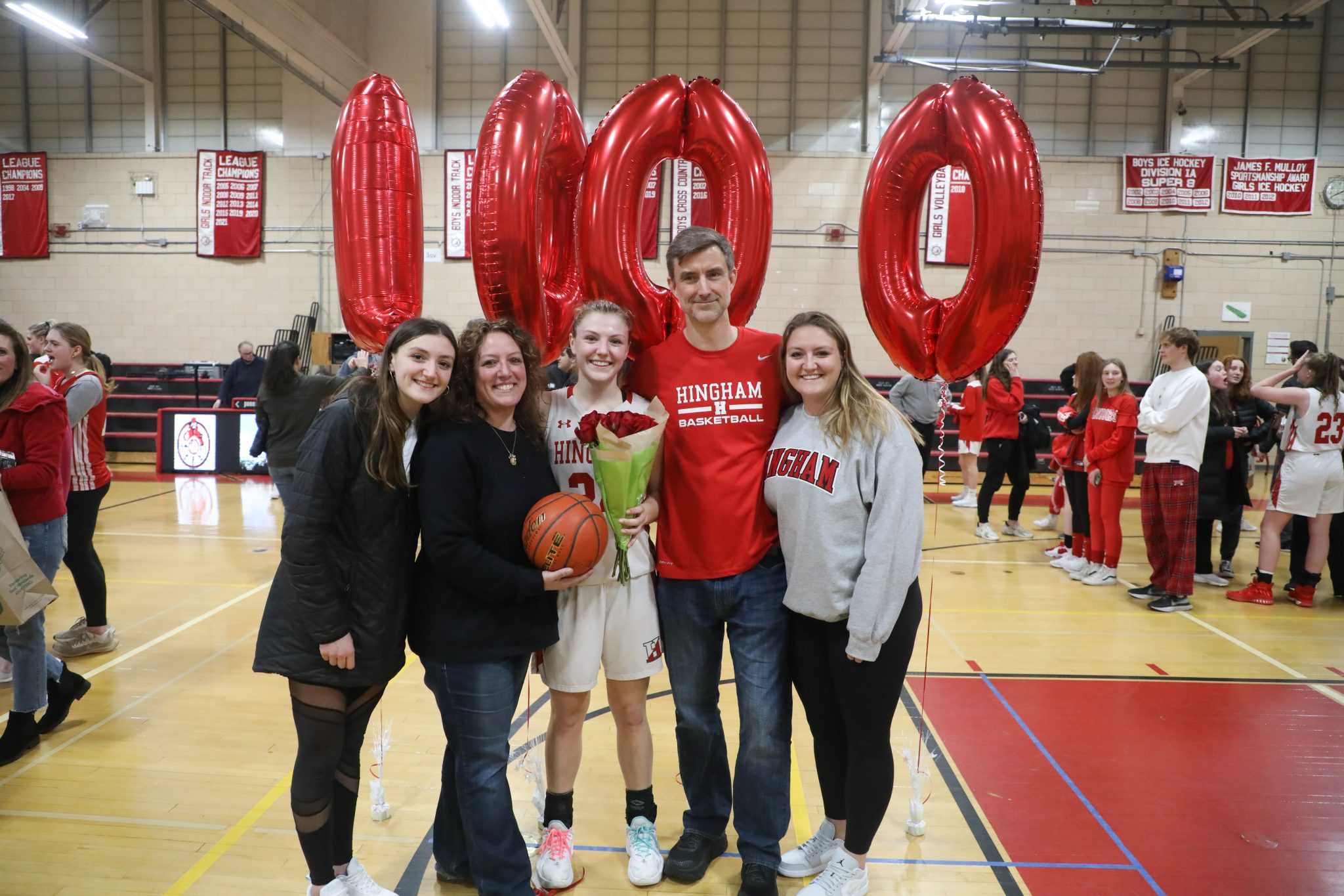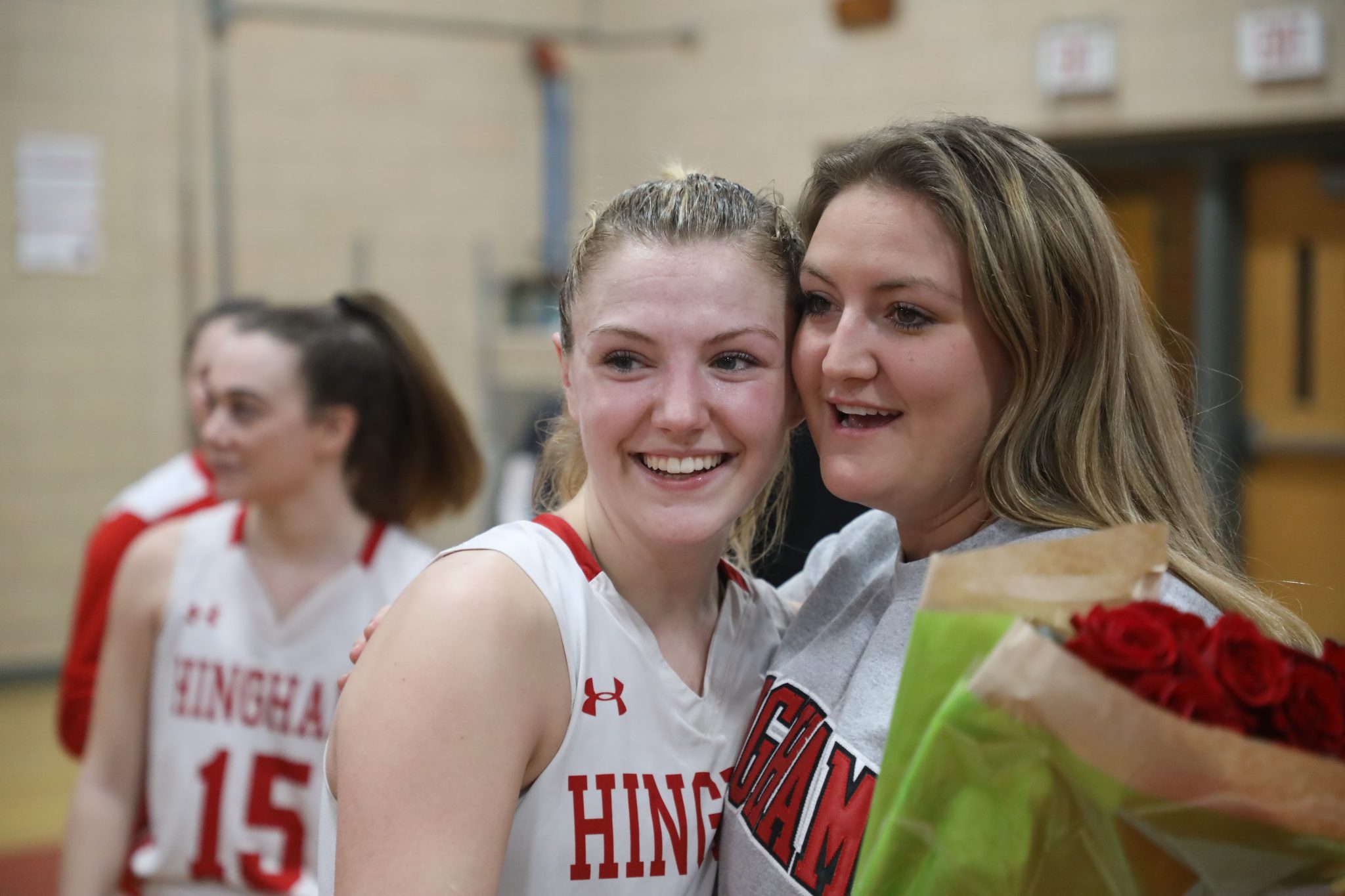 With just under seven minutes to go in the second quarter and her team down by two, the senior captain dribbled up the court, pulled up beyond the three point line and as the ball sailed through the netting, etched her name in the history books forever. At the next whistle, the game stopped and Hingham AD Jim Quatromoni announced to the crowd and to Blasetti herself, that she just became the only the second player in Hingham High School to score 1,000 career points. She had no idea she needed only 9 points to reach the milestone. Only a handful of people knew. Even her sister Ryley, who was in attendance, had no idea.