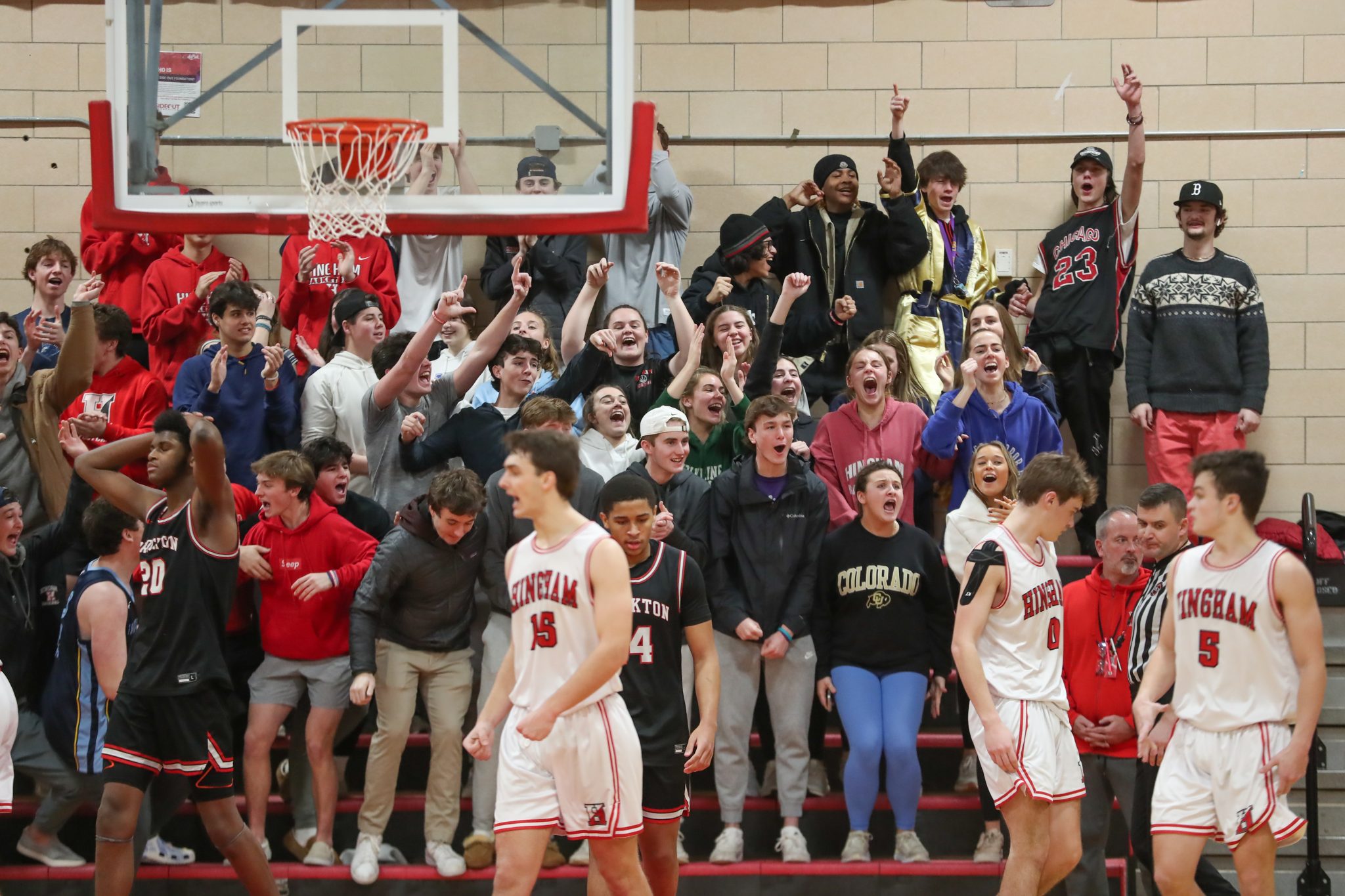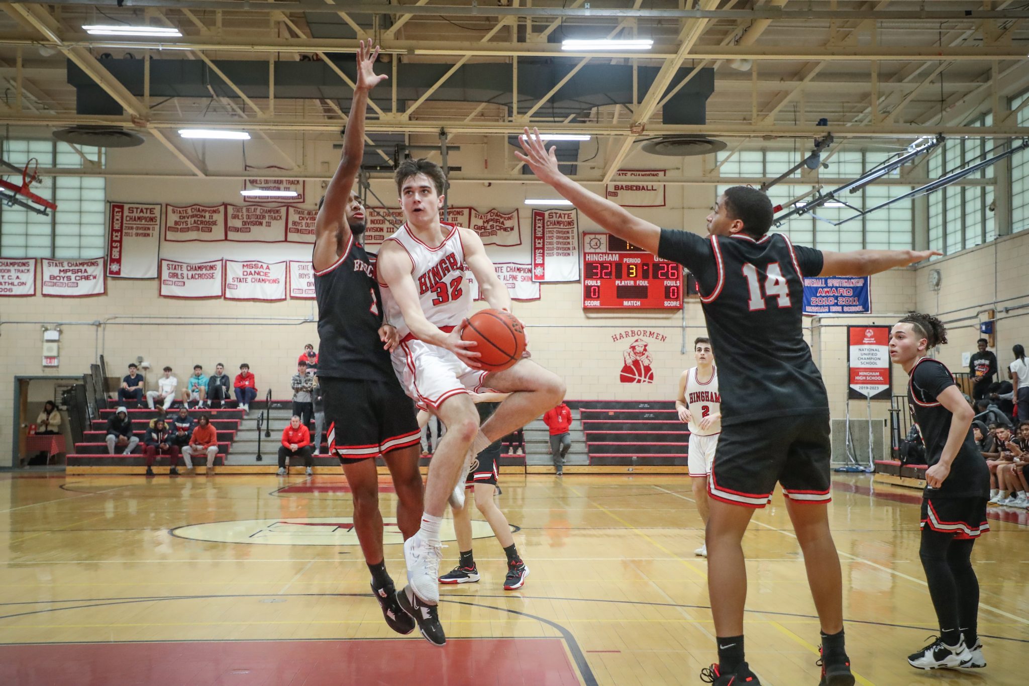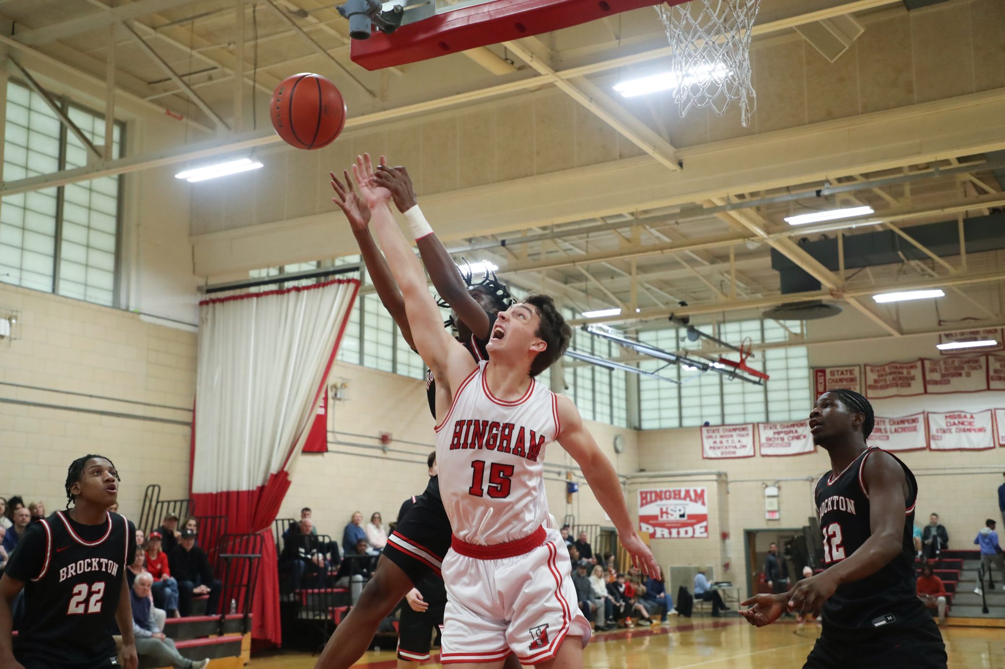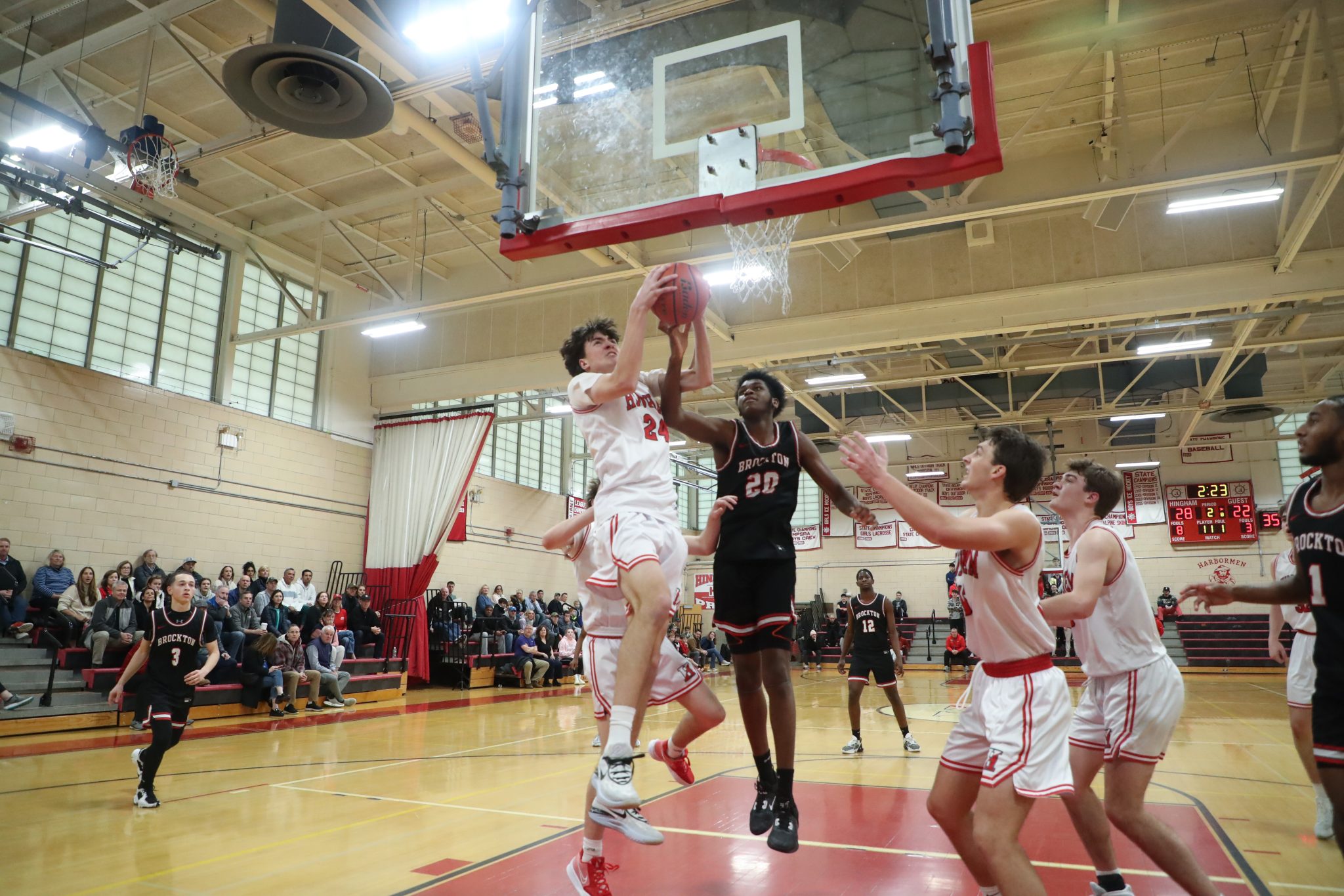 Hingham came out firing with two quick three’s from McBride and junior Chase Mello. The lead got to as high as seven points in the first quarter, but in what would be a precursor later events, Brockton settled down and closed the gap to three at the end of the first quarter. The second quarter was a competitive back and forth contest that saw each team score 12 points.