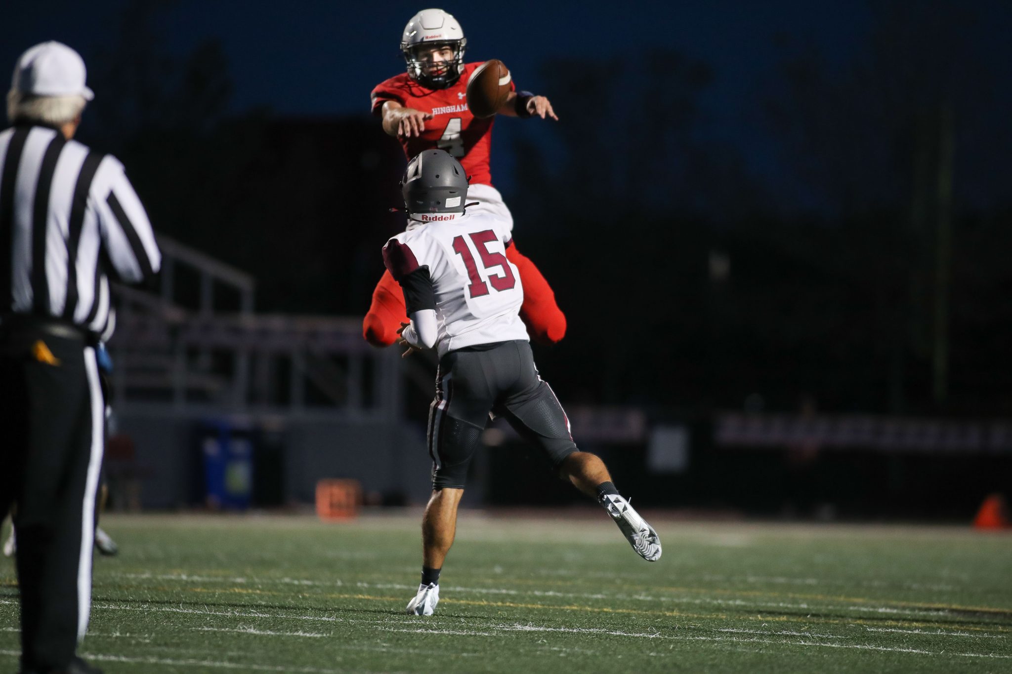 Senior Cam Dobson got in the throwing lane of the Arlington QB. He also blocked a punt and had a sack in Hingham's win.