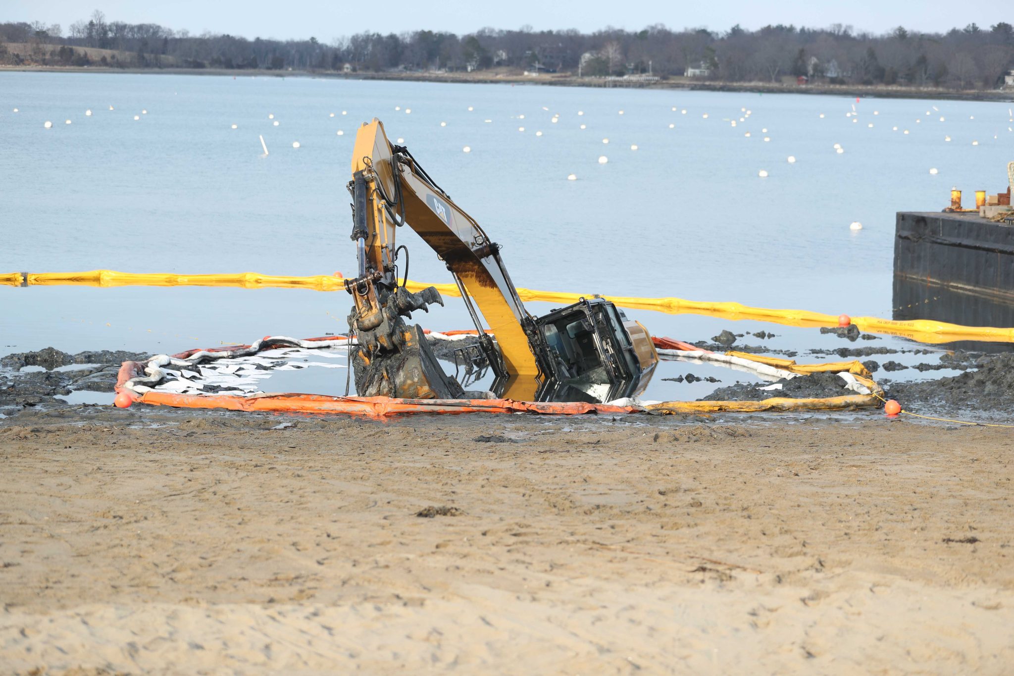 An excavator working on the new boat ramp at Hingham Harbor got stuck, then submerged yesterday afternoon as the tide began to come in. The Coast Guard, EPA, Harbormaster, and HPD were all on scene today to try and remove the large piece of machinery. Oil and gas has spilled into the harbor resulting from the submerged equipment. Removing it was unsuccessful today and they will try again at low tide tomorrow morning.
