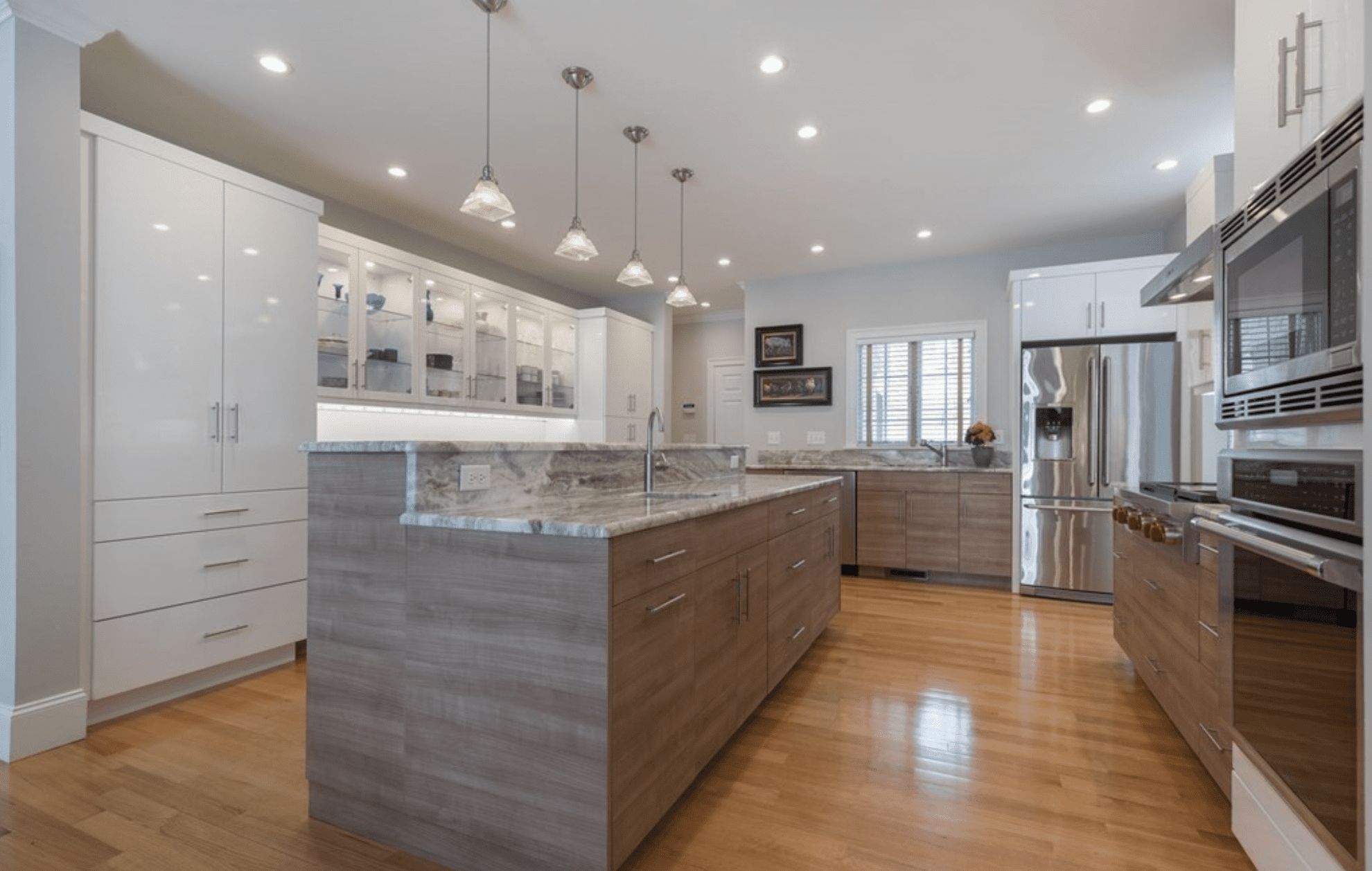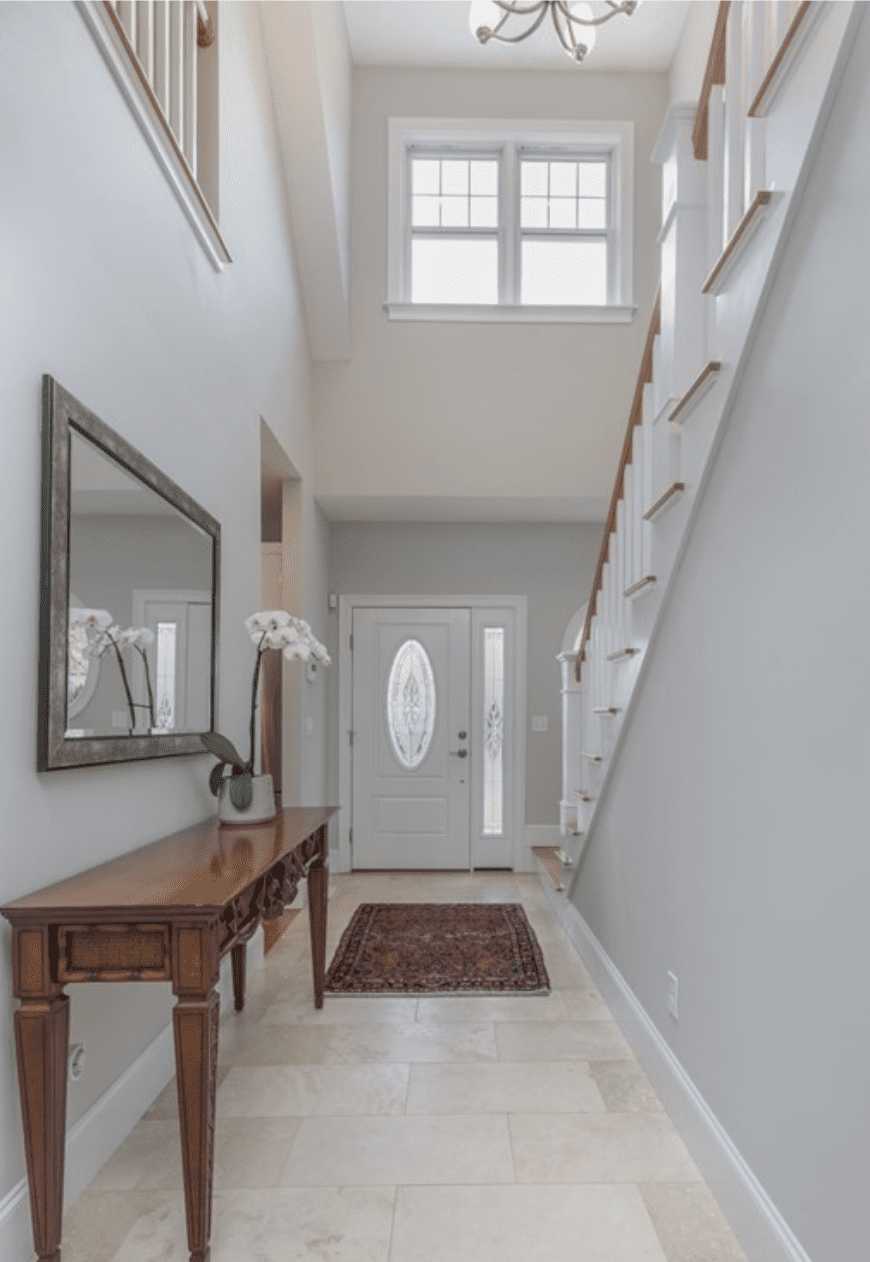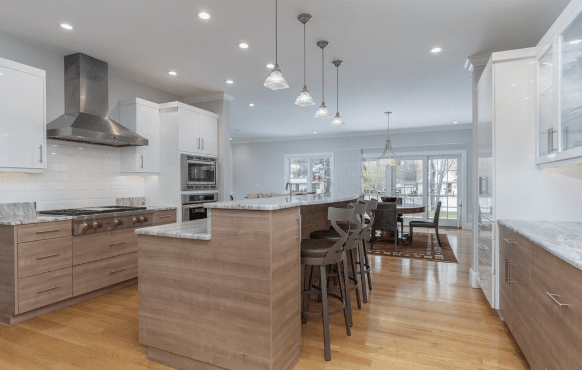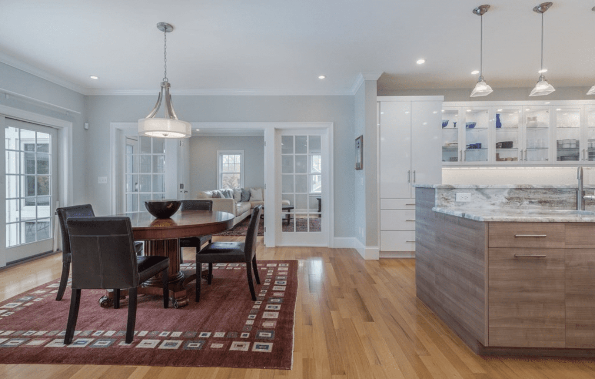 The double height foyer opens to a large Living Room. High ceilings, abundant windows & spacious rooms define this special home. The Living Room is anchored by a striking stacked quartz fireplace, flanked by custom bookcases.