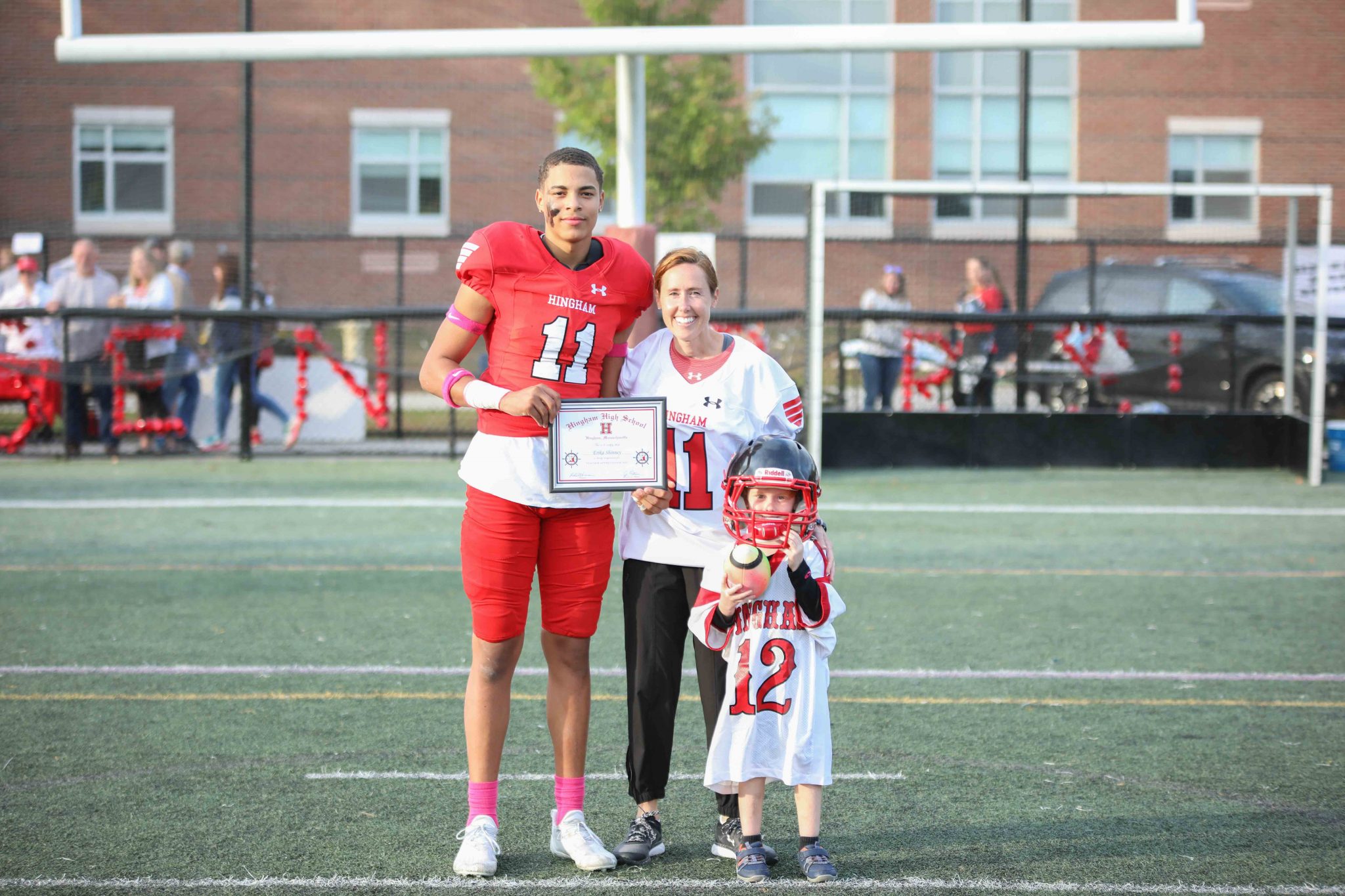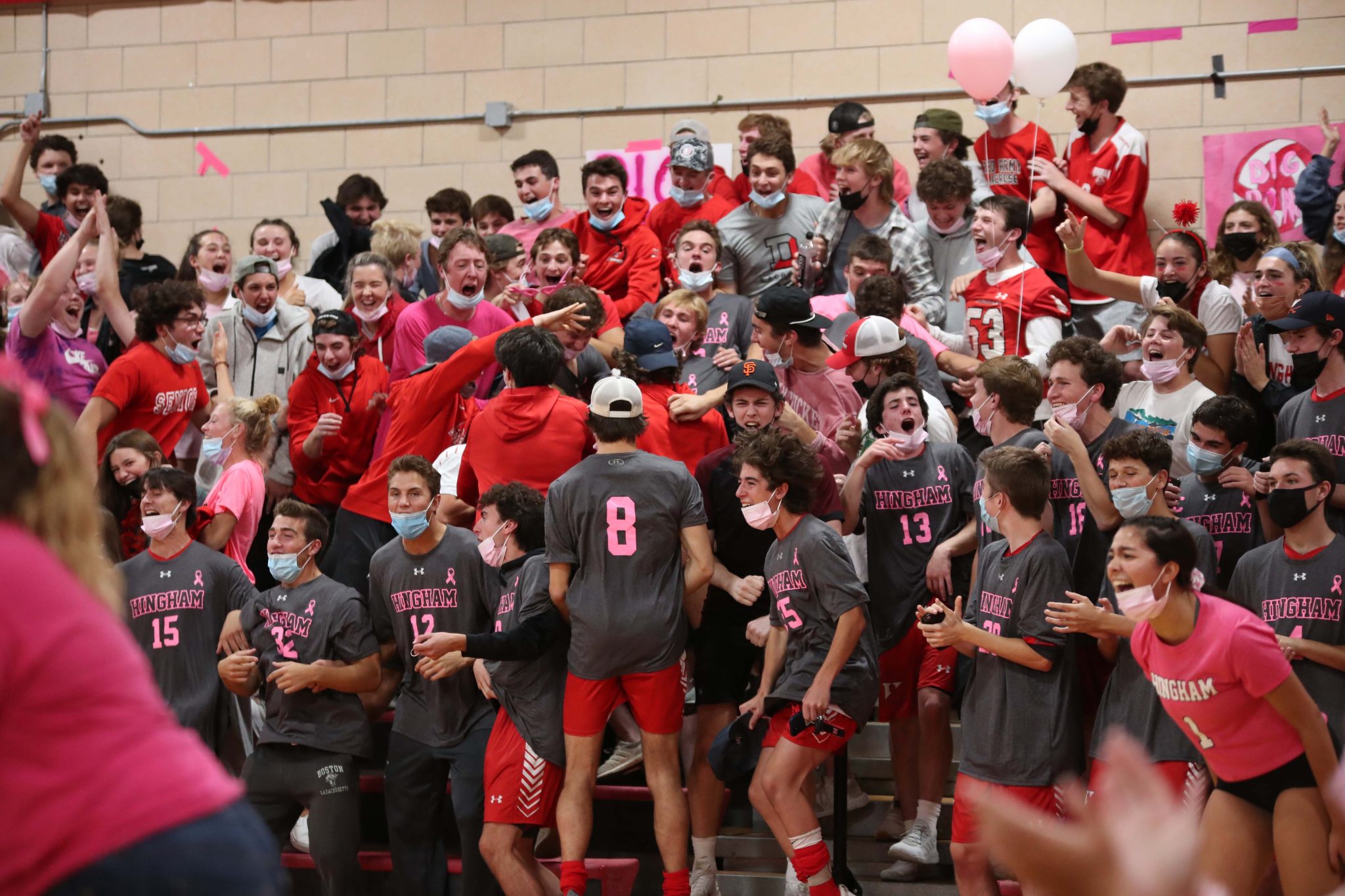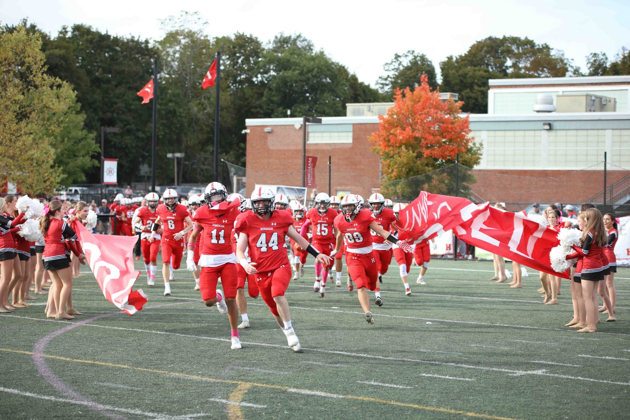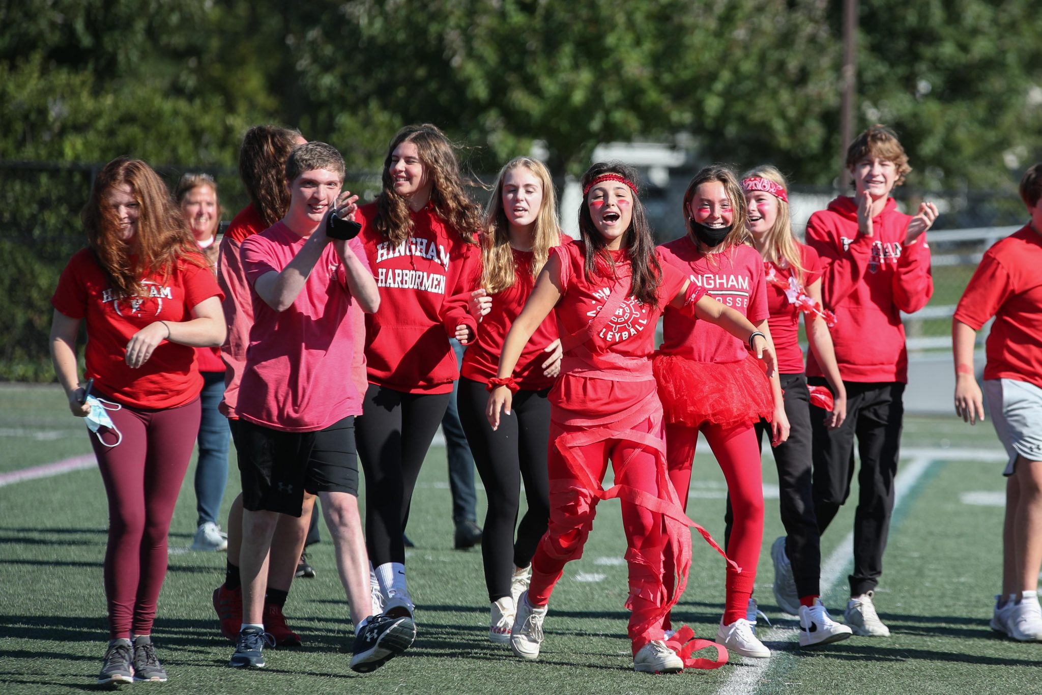 The festivities started early Friday afternoon as the whole school gathered as one for the first time in almost 2 years. The warm fall afternoon was a perfect setting to get the students and athletes ready for a full weekend of games and celebration. Each fall team was introduced during the rally, followed by a dance team performance, a quick soccer scrimmage, and a three-legged race that pared senior and freshman siblings together. It was also announced that Hingham High School was winner the Holmes Award for the third straight year. This is awarded to the school with the highest winning percentage of all varsity sports combined.