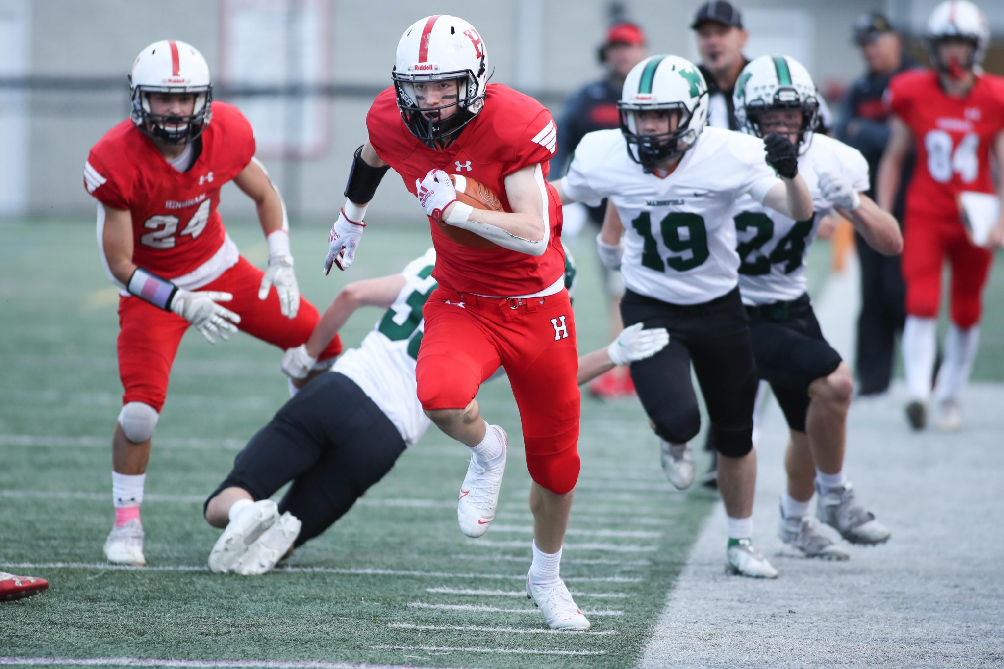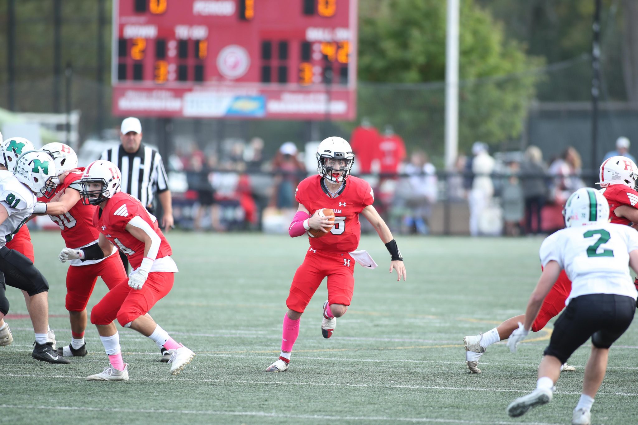 The day capped off with rivals Hingham and Marshfield battling it out on the gridiron. With stands packed, including Hingham's Pep band, the pre-game festivities included honoring the seniors and the parents of HHS Dance Team. The Harbormen were looking to keep the momentum going from last week's 35-0 win over Whitman-Hanson. Hingham took an early 7-0 lead in the first quarter on a TD catch by senior Jonathan St. Ange from QB senior Dylan Pierce. Unfortunately, the tide turned for the Harbormen after that score.