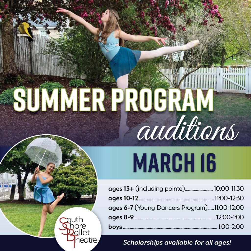 Auditions are March 16th (see attached) and can be used for summer as well as our year-round program. Register for auditions by clicking on the link ($20 registration fee).