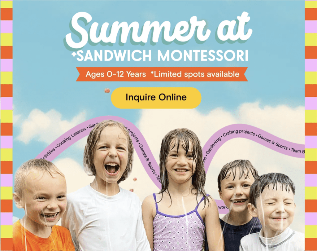 Sandwich Montessori School offers summer programs for children 0-12. Join us for age-appropriate nature exploration, sensory play, gross motor activities, arts & crafts, games, and team building activities are offered daily, with special visitors pop-ins, and Friday freeze pop and water play day! Activities include cooking projects with organic snacks, gardening and nature education, sensory play, art education and walkable community outings. Check out our website for more information – more details to be announced soon!