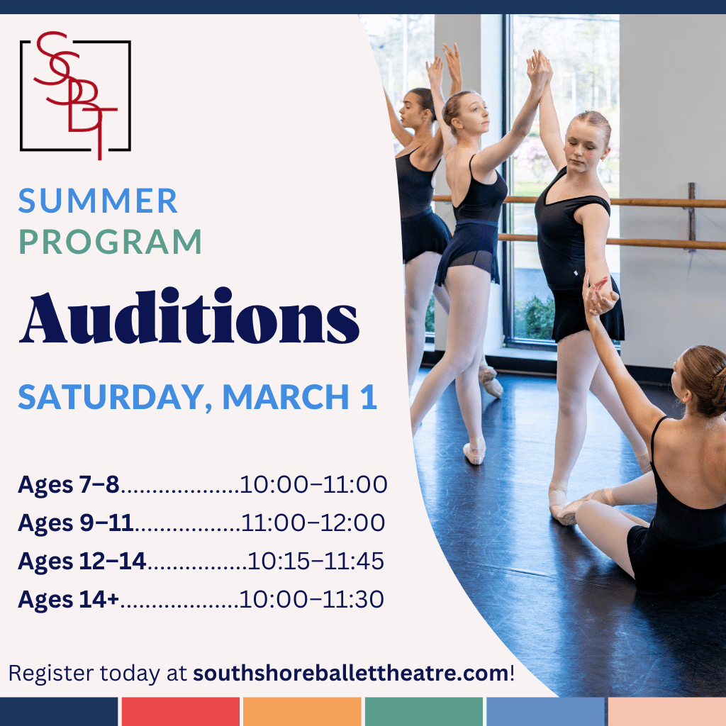 We are excited to announce that registration for South Shore Ballet Theatre’s Summer Program for 2025 will open on February 15th! Our summer offerings are designed to help students of all ages stay in shape, refine their skills, and have fun while dancing. Whether your child is a dedicated dancer or just wants to try something new, we have an excellent range of programs to suit every need.