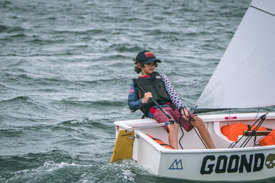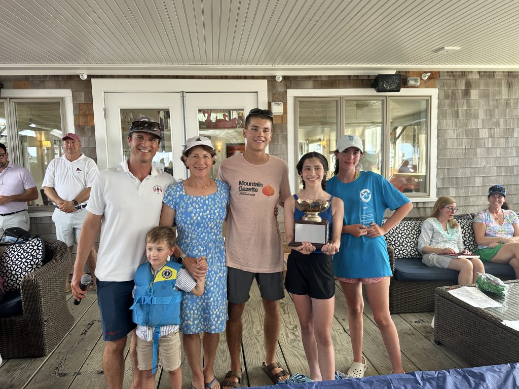 As part of the awards ceremony, perpetual trophies are given each year to participating sailors in the name of former Hingham Yacht Club members and sailors. This year featured the first presentation of the Rebecca Binder Award, recognizing outstanding performance in the Opti green fleet. For her determination and perseverance on the race course, Annisquam Yacht Club’s Violet Kontos was recognized as the first recipient of this new award. The Ginny Gray Award is given in recognition of a participant who demonstrates an outstanding act of seamanship or sportsmanship, and this year’s Ginny Gray Award was presented to three recipients. Coach Sam Dunn and Opti sailor Zara Hershiser, of Hingham Maritime Center, were recognized for demonstrating the power of an exceptional sailor-coach relationship, and 420 sailor Grace Newman, of Hull Yacht Club, was recognized for her support of other competitors during racing. Finally, the Thomas E. Curtis Jr. Trophy, which is awarded to the sailor with the best overall performance, was presented this year to Opti sailor Briggs Kossmann, who ended the regatta with seven first-place finishes in his fleet.