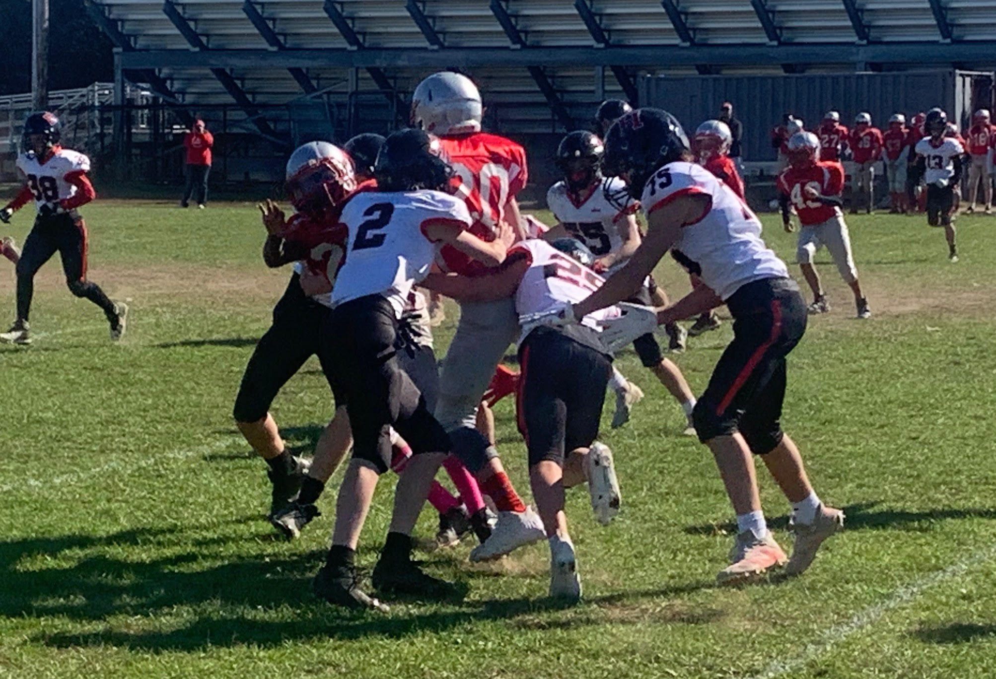 A beautiful autumn Sunday on the Cape featured the 8th grade Raiders fighting off a stubborn Barnstable team 27-8 to remain unbeaten and atop the league standings. With Drew St Pierre sidelined with a foot injury, running back Ian Smith had a banner day with 2 touchdowns and 3 kicked extra points to lead the offense.