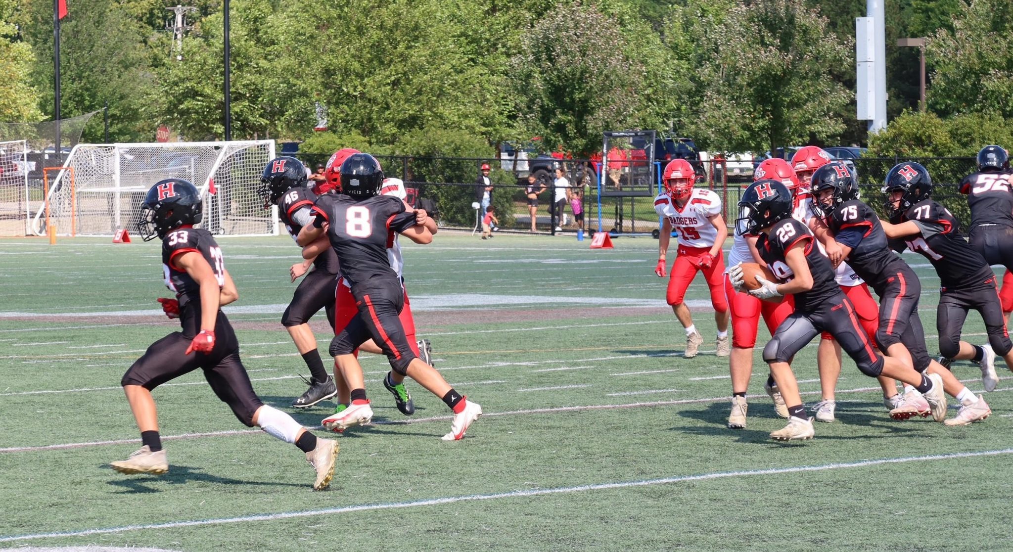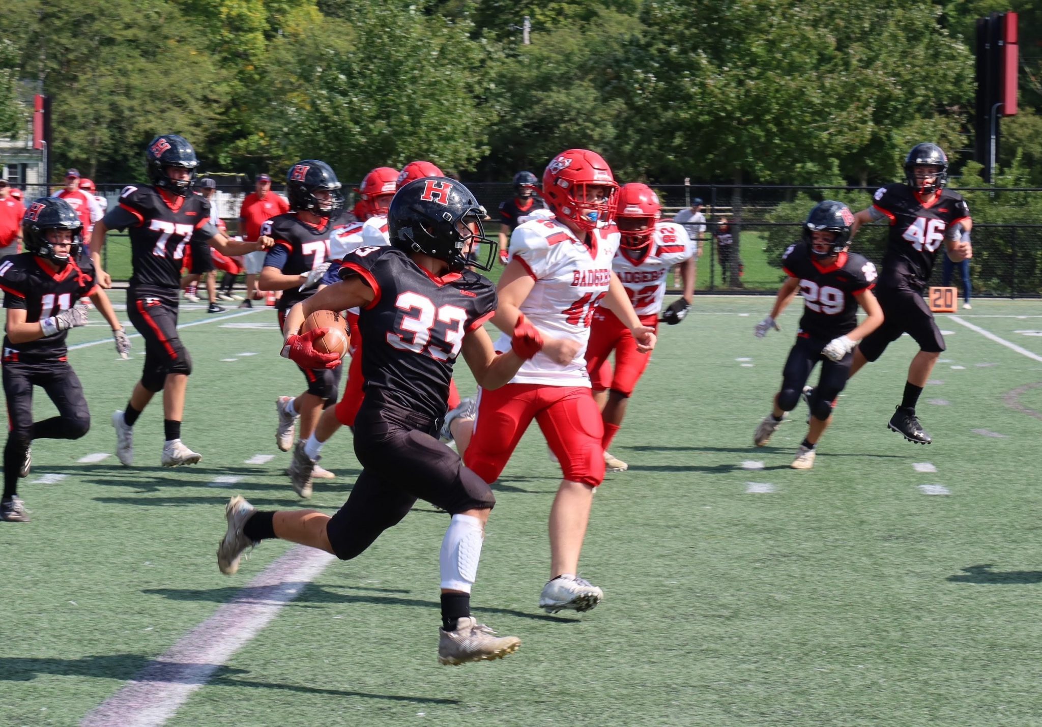 In the 2nd quarter the Badgers began to gain momentum with their running game when Chase Beighley, Ian Smith and Aedan Milligan made tackles to force a critical 3rd down. The Badgers dared to test the Raiders secondary and threw a deep pass into the end zone where safety Deacon Evriviades made a spectacular leaping interception to kill the Badgers potential scoring drive. QB Jake Varholak operating out of the shotgun ran 18 yards for a first down behind the O-Line blocks of Griffin, Sullivan, Leopold Kuehberger, Mac Corey and Shape but the Badgers defense eventually forced the Raiders to punt. On defense CB Ian Smith and Charlie Shape made jarring tackles and then Sullivan shot the gap to tackle the RB and thwart the drive for a 0-0 stalemate at the half.