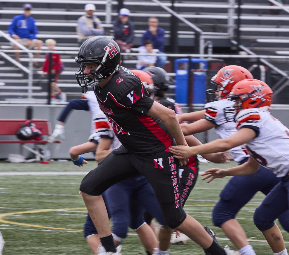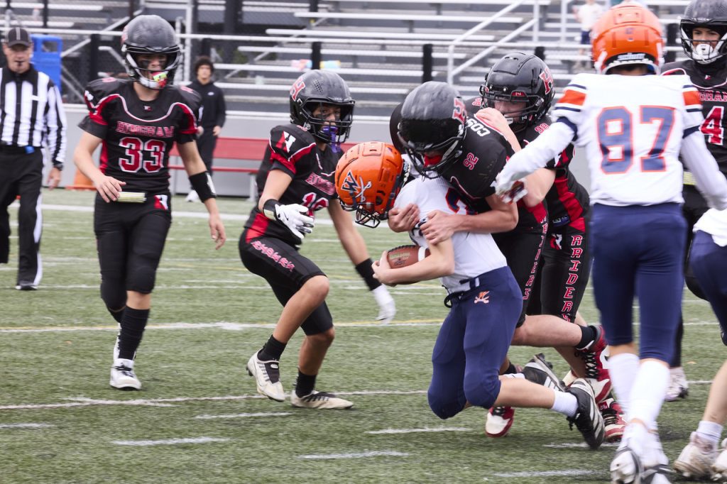 The 8th graders exhibited what an elite offense they have by scoring 7 touchdowns against the Walpole Rebels on Sunday. Whether in the air or on the ground the Raiders scored on almost every possession as the defense dominated the line of scrimmage to earn the victory.