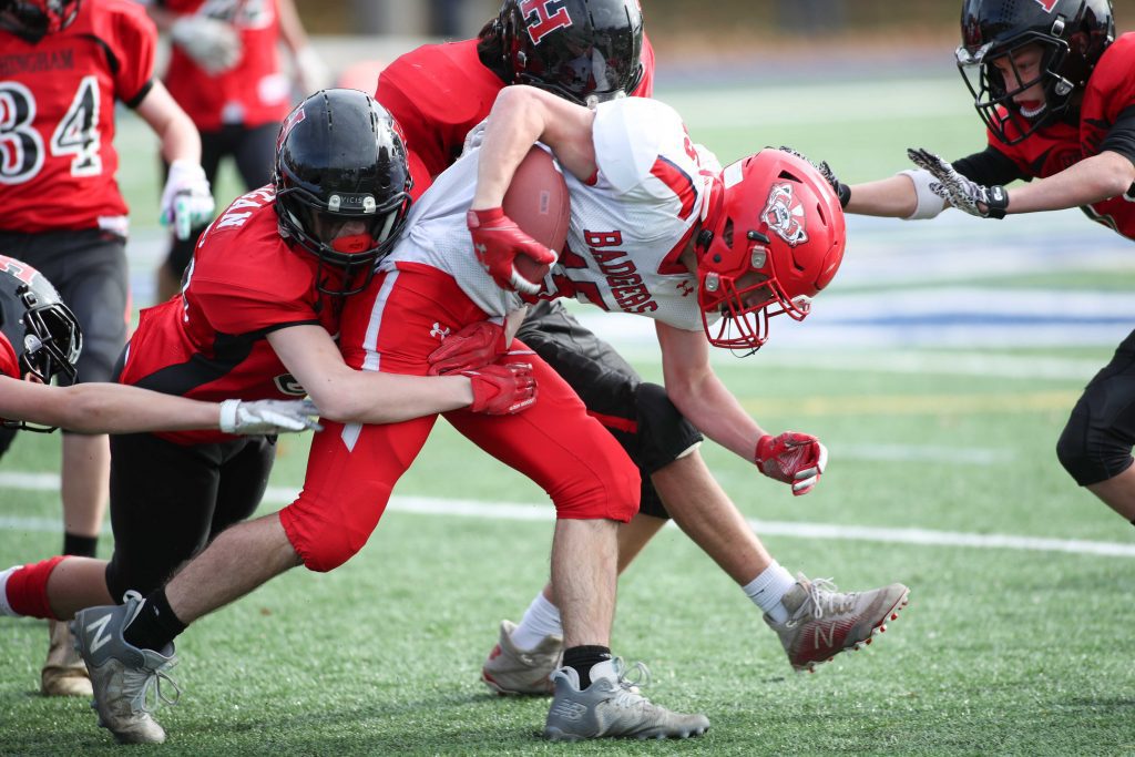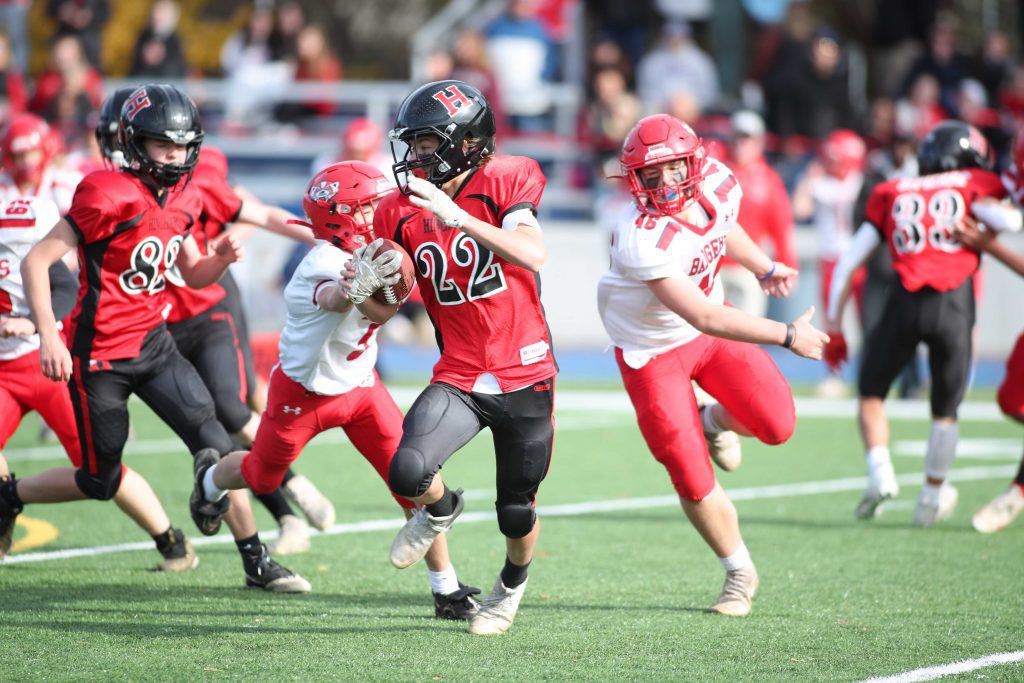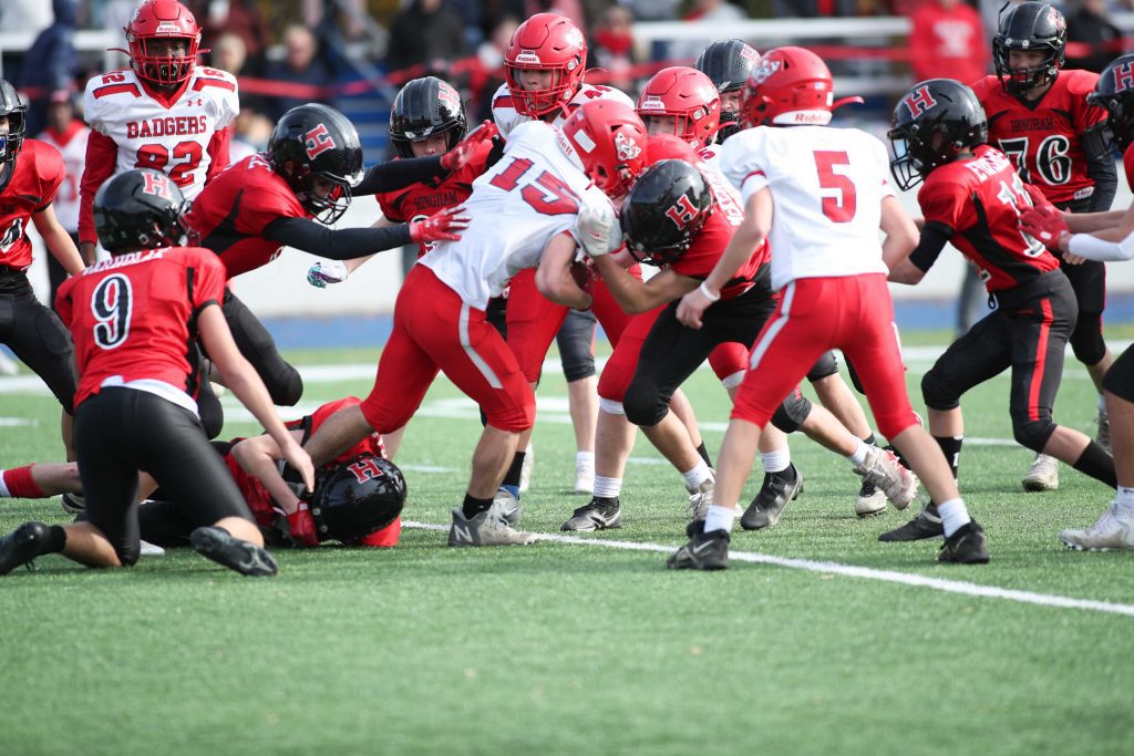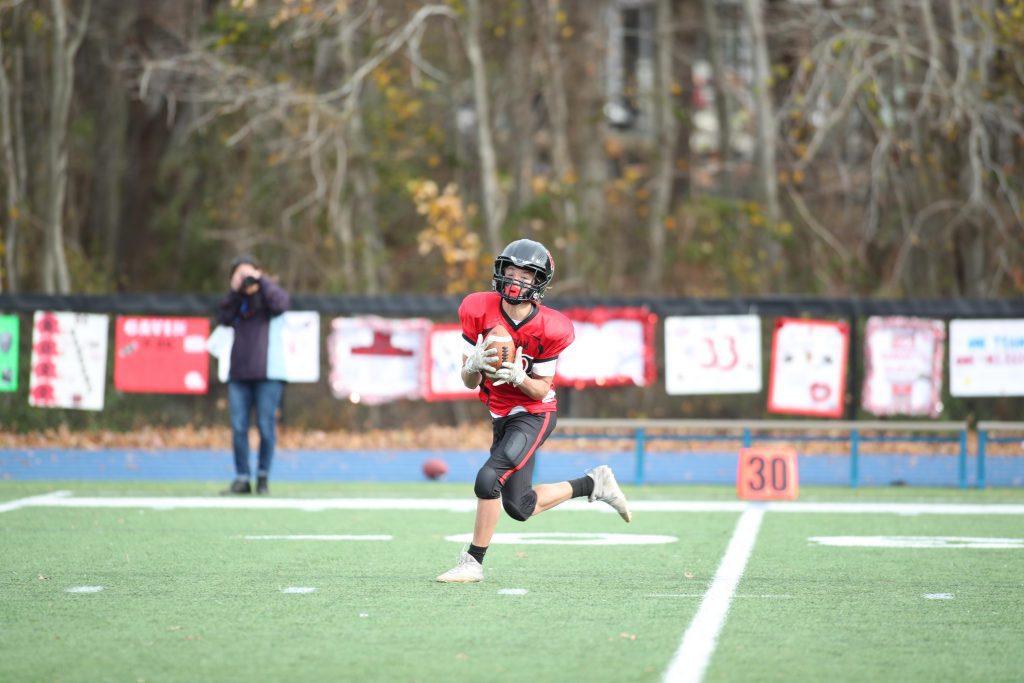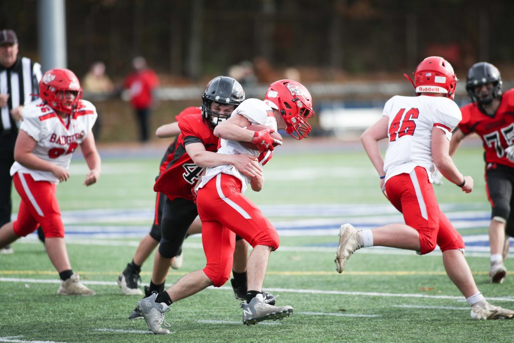 The Badgers rushing attack was fierce, but was met with gritty force as Chase Beighley, Cam McKenna and Mac Corey tackled the ball carriers and Andrew Sullivan pressured the QB and batted down a 4th down pass to force a turnover on downs. Looking trapped, QB Varholak followed blocks from Charlie Shape, Leopold Kuehberger and Wyatt Averett to scamper for a 36 yard touchdown and a 14-6 lead at the end of the 1st quarter. The defense crushed the Badgers next drive with line penetration from Eli Melendes and Matt Griffin as Chase Beighley, Aedan Milligan and Drew St Pierre tackled the ball carriers securing a 14-6 lead at halftime.