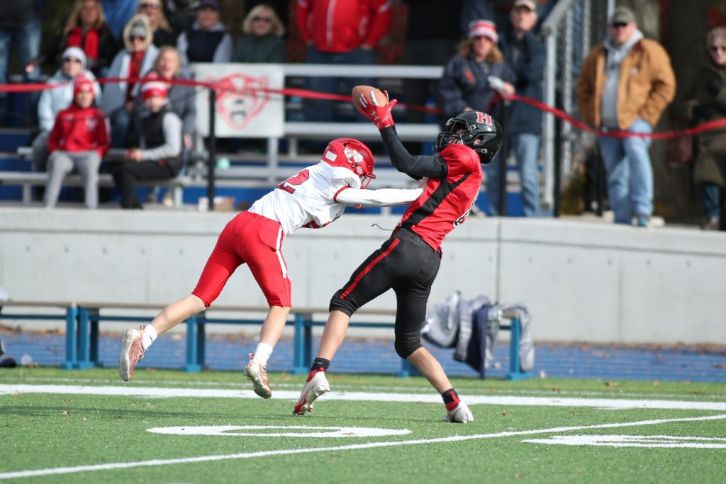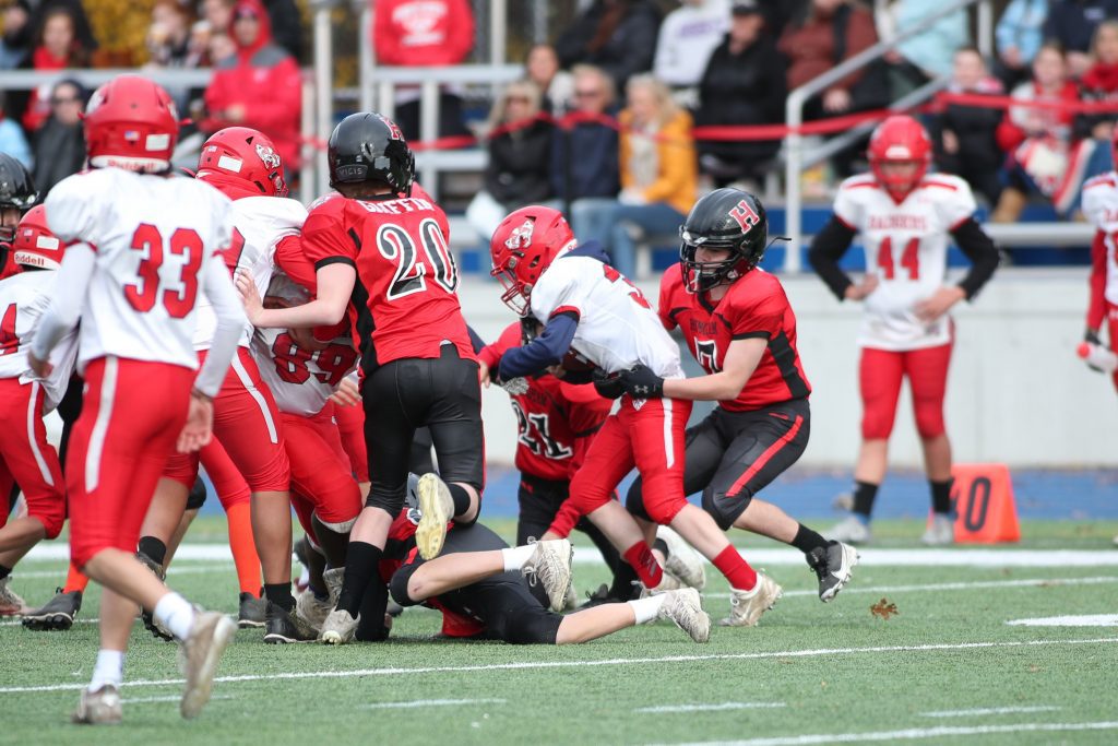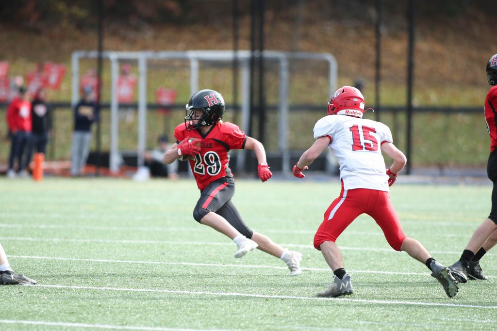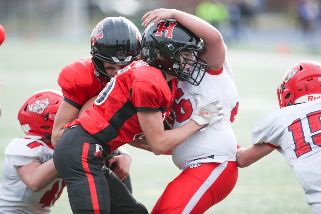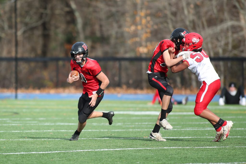 The Raiders picked up right where they left off at the half, showing their muscle on both sides of the ball as QB Varholak connected with his solid target Ian Smith for a 39 yard TD pass and a 22-6 lead. Hingham owned the third quarter as their defense began to smother Bridgewater. Charlie Shape sacked the QB for a loss and on the next play safety Deacon Evriviades lept and tipped a pass which Drew St Pierre intercepted and returned deep into Bridgewater territory. Riding the momentum, Drew St Pierre caught a short pass from Varholak and turned it into a 38 yard gain setting up a first and goal. One play later Varholak followed his blockers Sullivan and Kuehberger for the TD. Back on offense and doing what he does best, QB Varholak scrambled and connected with an outstretched wide receiver Deacon Evriviades for a spectacular TD reception to take a commanding 35-6 lead.