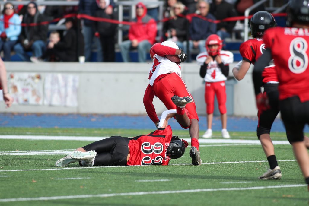 Taking the opening kickoff, Bridgewater looked like they were going to return it to the house when Jake Varholak tackled the returner at the 10 yard line. With their backs to the wall, Aedan Milligan, JT Reale and Cam McKenna tackled the ball carriers to force a 4th down, where Bridgewater eventually hammered it in for a TD and the 6-0 lead. It is was only for a brief moment that the Raiders would trail, as QB Jake Varholak on 4th and long completed a pass across the middle to Ian Smith who shed two would-be-tacklers for a 41 yard TD. On the point after, Varholak found Cavan Nicholas in the corner of the end zone for the 2 point conversion to retake the lead 8-6. A lead which they would never relinquish.