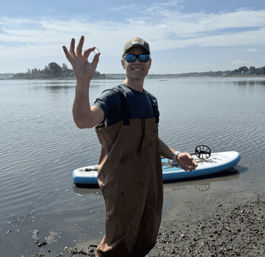 With his wife, Julie, and Kelley cheering him on, he kept going. He did one more pass with the detector as he approached the buoy again and this time heard a faint, but different, sound. Two scoops yielded only more mud, shells, and worms, but, still hearing a ping, his third scoop filled with a thick clay. This scoop wouldn’t rinse with water so he reached in and cleared the clay with his fingers. Not finding anything at first, he almost moved on, but grabbed the clay at the bottom of the scoop and, to his amazement, he found he was holding a ring.