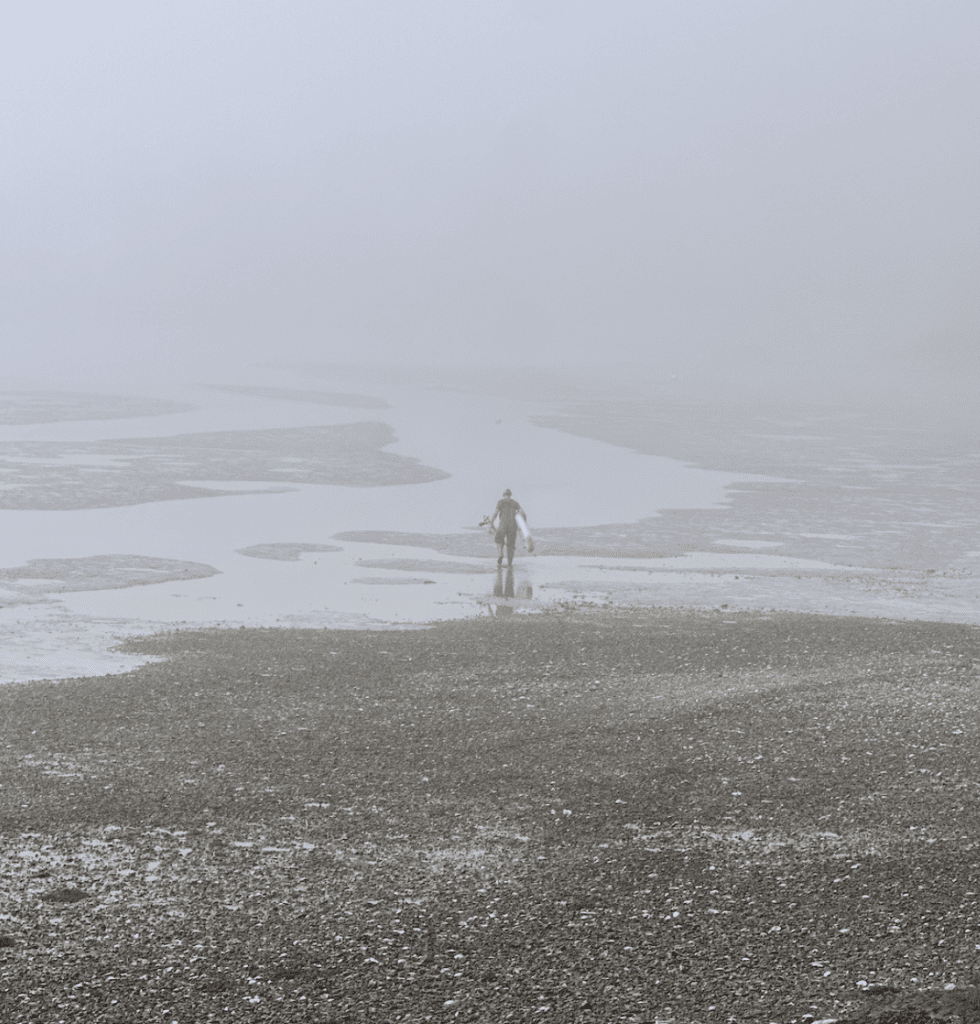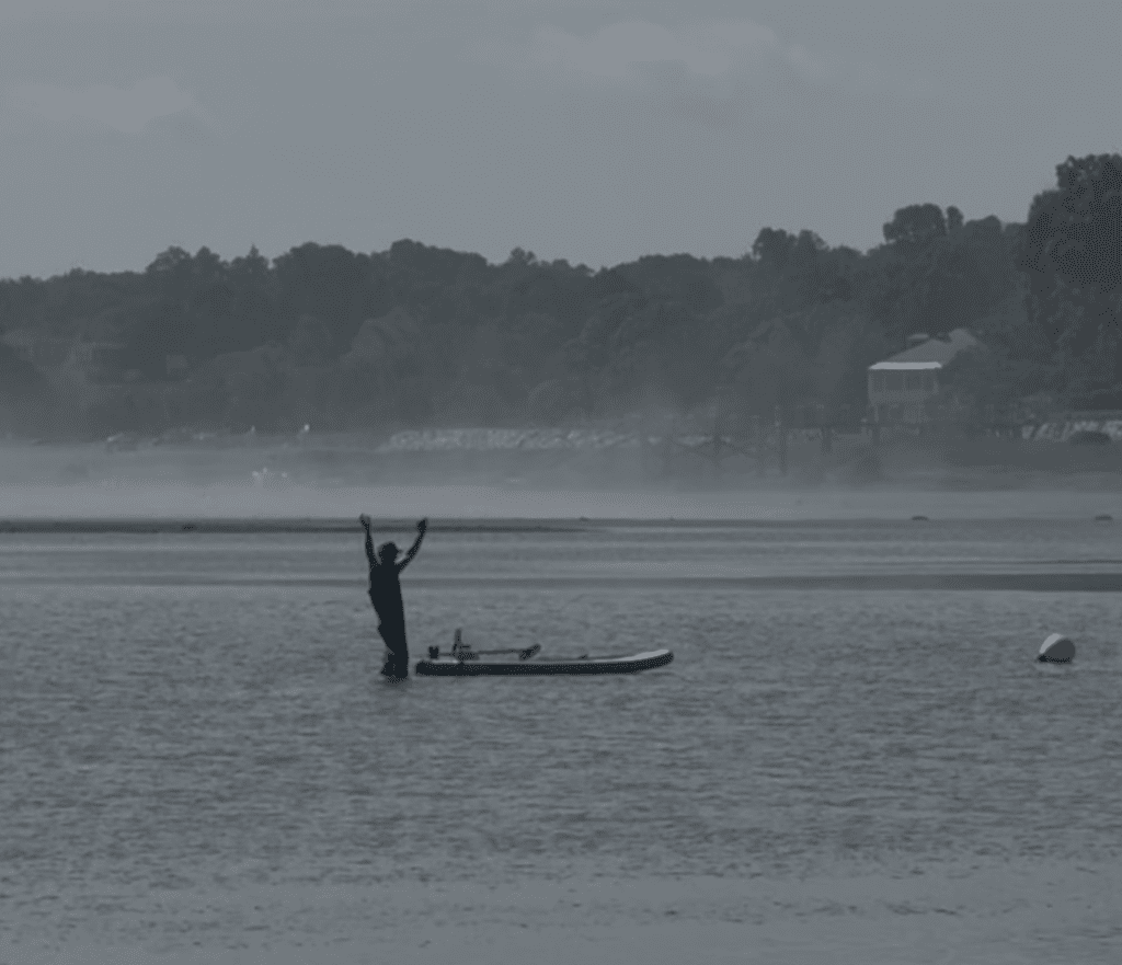 Fueled by hope, and despite the early morning fog, Tom set out this past Sunday for what he considered his final rescue attempt. It was low tide, and he was wearing Chris’ fishing waders while using Kelley Testa’s paddle board to keep from sinking too deeply into the muck. With each step, he sank almost up to his knees into the clay-like harbor floor, relying on the paddle board for balance and to hold his gear.