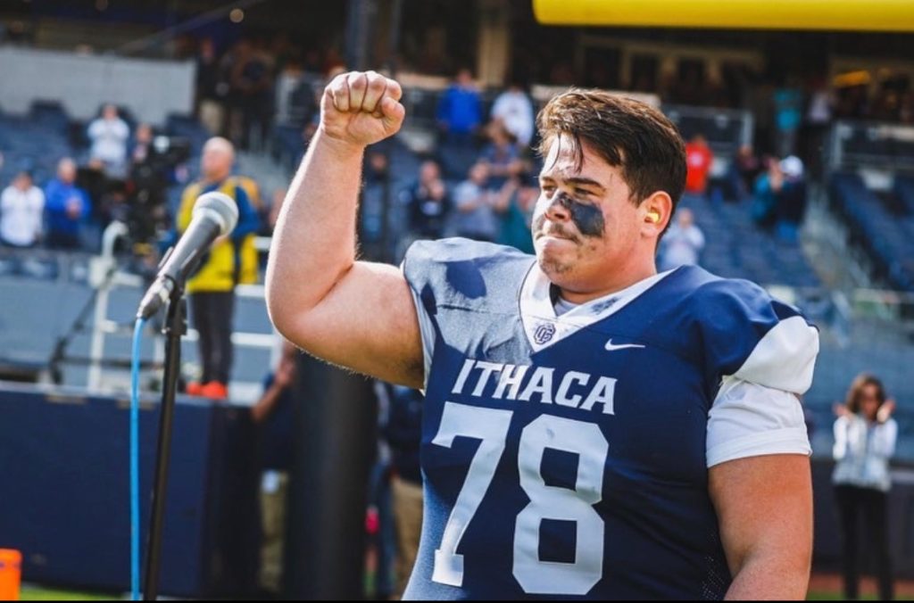 Curious to learn more about the talented vocalist from our own town, we searched his name online. The first result was a video of Nick, dressed in his Ithaca College football jersey, singing the National Anthem before a game. It was immediately clear there was a deeper story behind this gifted Hingham resident.