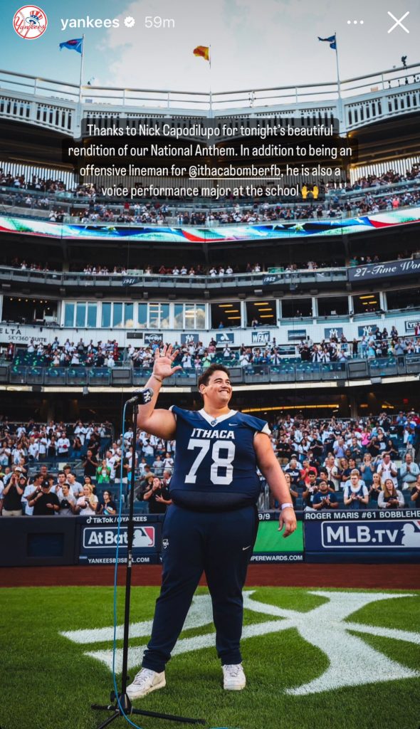 His career reached an even larger stage when he performed at Yankee Stadium before a major college rivalry game. After seeing the video, the Yankees invited him to sing before a Yankees–Red Sox matchup that same year, where a Green Beret sergeant throwing the first pitch recruited him years later to sing the National Anthem at the Special Operations Forces Conference in Tampa last May.