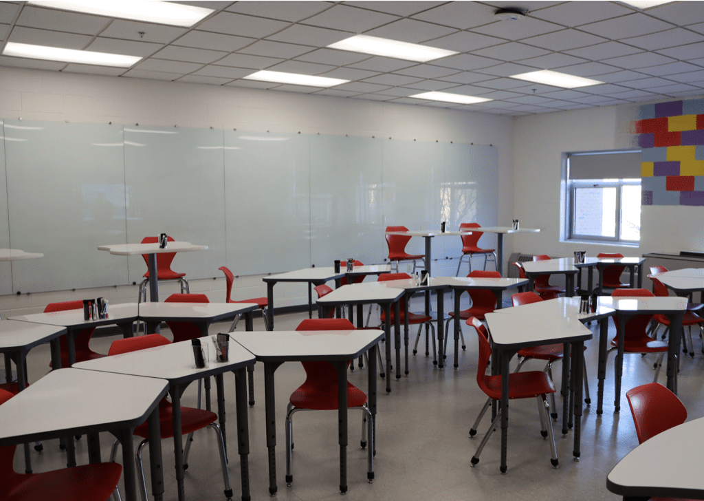 Hearing from students and teachers in the classrooms, the enthusiasm is palpable. Many students allude to feeling less stress, enjoying the open space to work in, the ability to collaborate, and the ease of restarting or fixing an equation using the dry erase markers. As one student said, “The new classroom setup allows me to express my work more clearly and has significantly improved not only my assessment scores, but my understanding of math.” Another added, “I love the new furniture. It makes the space feel less intense and brings an air of warmth and excitement into the classroom.”