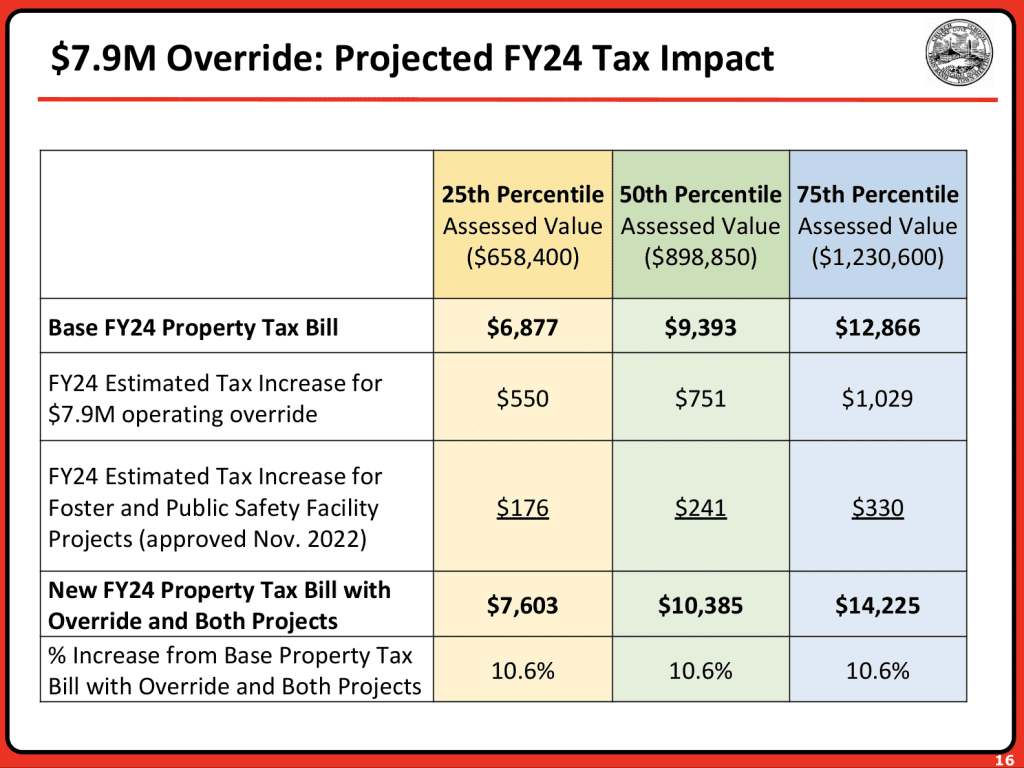 At the same time, he noted, there are concerns about the impact passage of the override would have on property taxes. “That’s certainly not insignificant.” (See related chart representing Fiscal 2024 property tax impacts, which are expected to increase in Fiscal 2025 and 2026.) Danis explained that property owners would experience a roughly 10 percent increase in their property taxes for Fiscal 2024 alone if the override passes.
