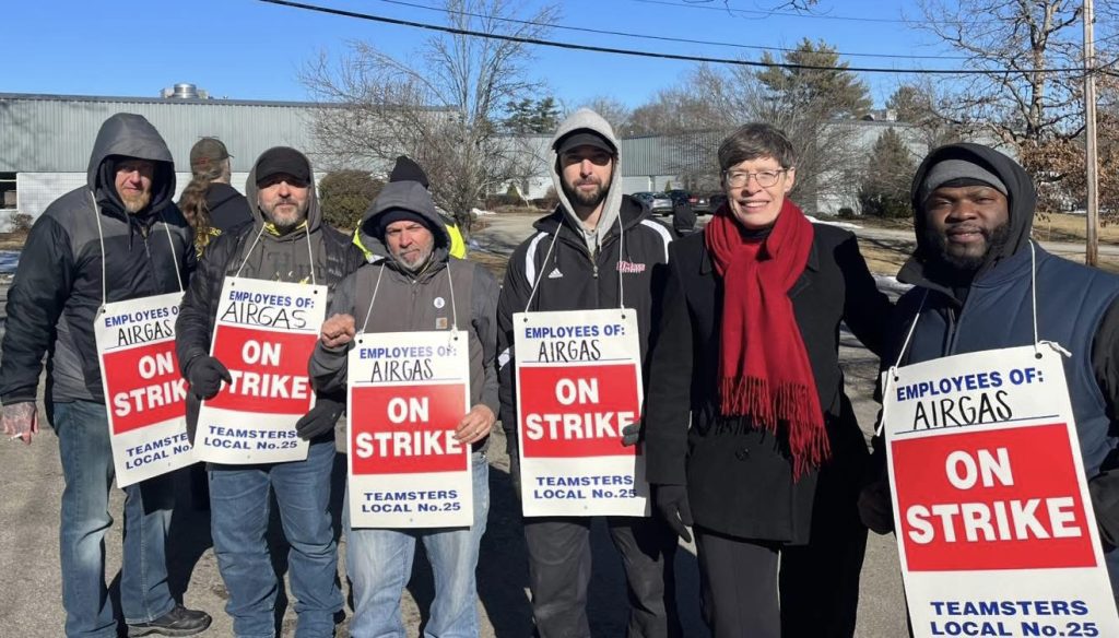 Teamsters Local 25 members at Airgas Hingham are on strike after unanimously voting down the company’s insufficient and insulting contract proposal.  The 13 workers went on strike when their contract expired February 1 and will hold the strike line 24/7 until the company provides its workers with the pay and benefits they deserve. The striking Teamsters are getting support from the community and local elected leaders, including State Rep. Joan Meschino, State Senator Patrick O’Connor and State Senator Paul Feeney who all visited the strike line and expressed support for the Local 25 members in their bid for a fair contract.
