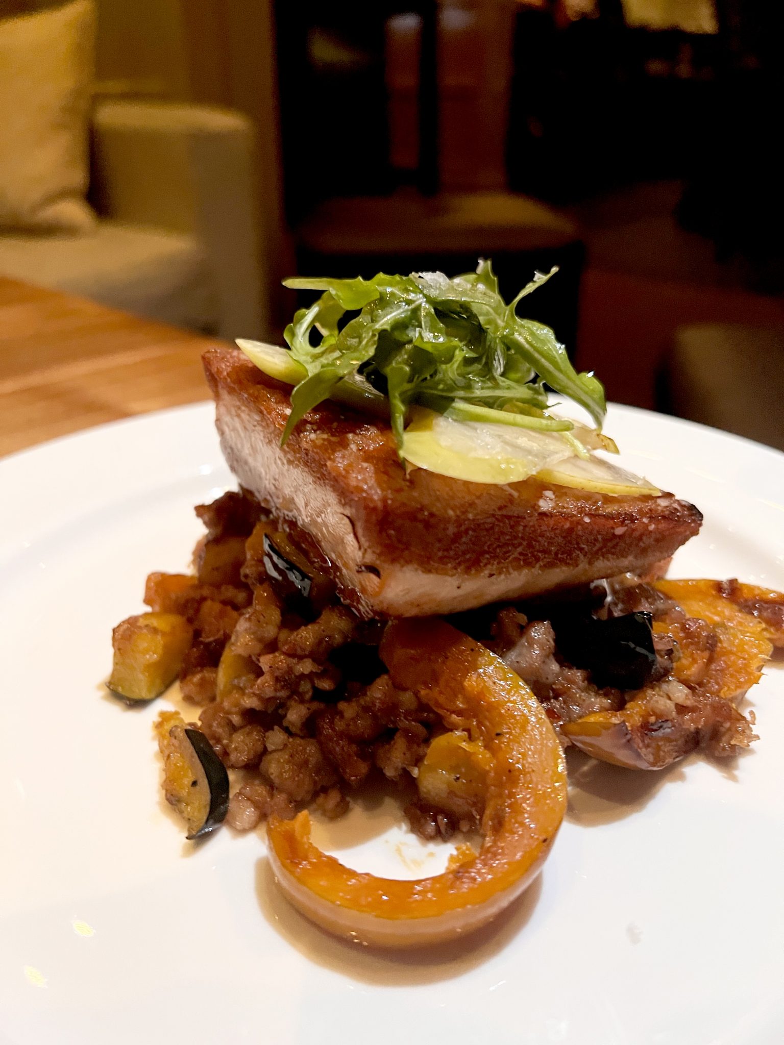 If you’re craving more seafood, this pan-seared Faroe Island salmon is placed upon a vegetable ragout composed of acorn and honey nut squash. Crumbled sausage adds a bit of texture, and arugula and slivered pears cut through the richness.