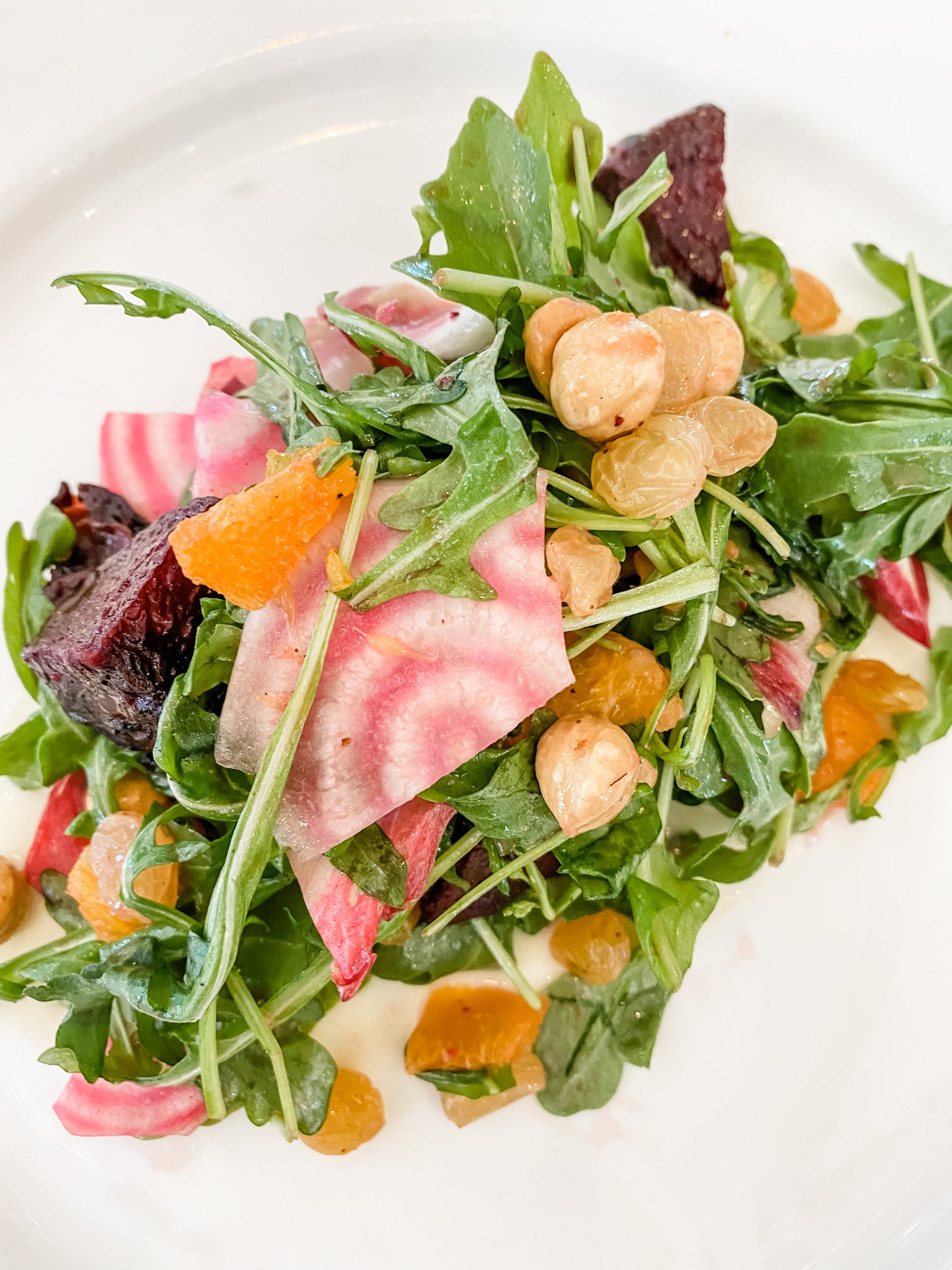This visually stunning salad is composed of roasted and candy striped beets, blood orange segments, Belgian endive, toasted hazelnuts, and sultanas, which are Turkish white grapes that are dried out and then re-hydrated with water to create a sweet plump gem. The dish is plated with a gorgonzola dolce crema, and the dressing is made of blood orange juice, red wine vinegar, olive oil, and salt and pepper. The gorgonzola crema does contain a flour-based roux, and a gluten-free option can be made easily with simply adding fresh, crumbled gorgonzola cheese. We loved the texture of the sweet beets and sultanas paired with the smokey roasted hazelnuts, and finished with the acidity of the tangy blood orange.
