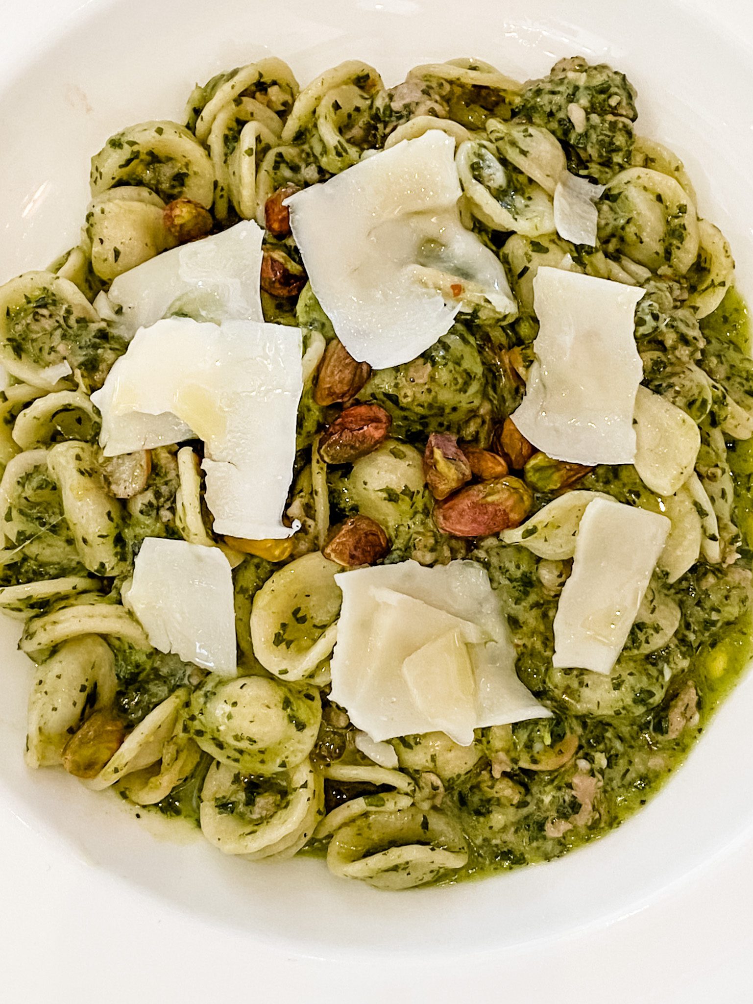 Parts of this dish are traditional and other parts of this famous pasta dish include a fun twist. Instead of using basil, Chef uses broccoli rabe as the base. The rabe is blanched and then pureed with olive oil, pistachios, tarragon, basil, Romano cheese, and lemon juice, which softens the often bitter green. Slivered garlic is softly cooked in olive oil and Bianco & Sons Italian sausage is sauteed with fennel seed, and deglazed with wine and chicken stock. The dish is finished with toasted pistachios. We love the flavor and hint of the broccoli rabe that is rounded out with the savory sausage, and some crunchy pistachios.