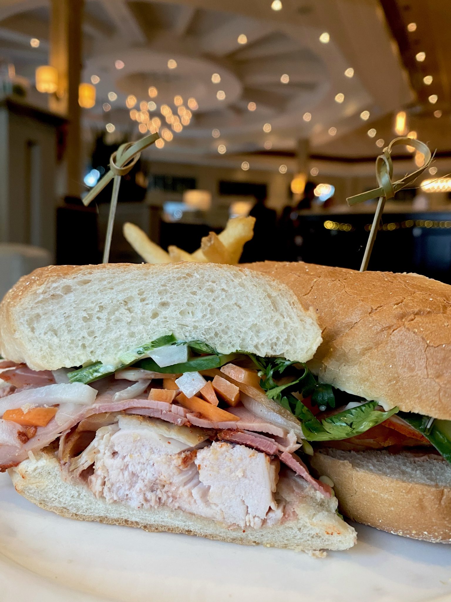 This Vietnamese and French-influenced dish is a fun sandwich to try for lunch. A large flakey baguette is filled with pork liver pate, sliced crispy roasted chicken breast, spicy Tasso ham, and topped with jalapenos, cilantro, pickled carrots and daikon, kewpie mayo, and cucumbers. A side of fries is served alongside this tangy and rich sandwich.