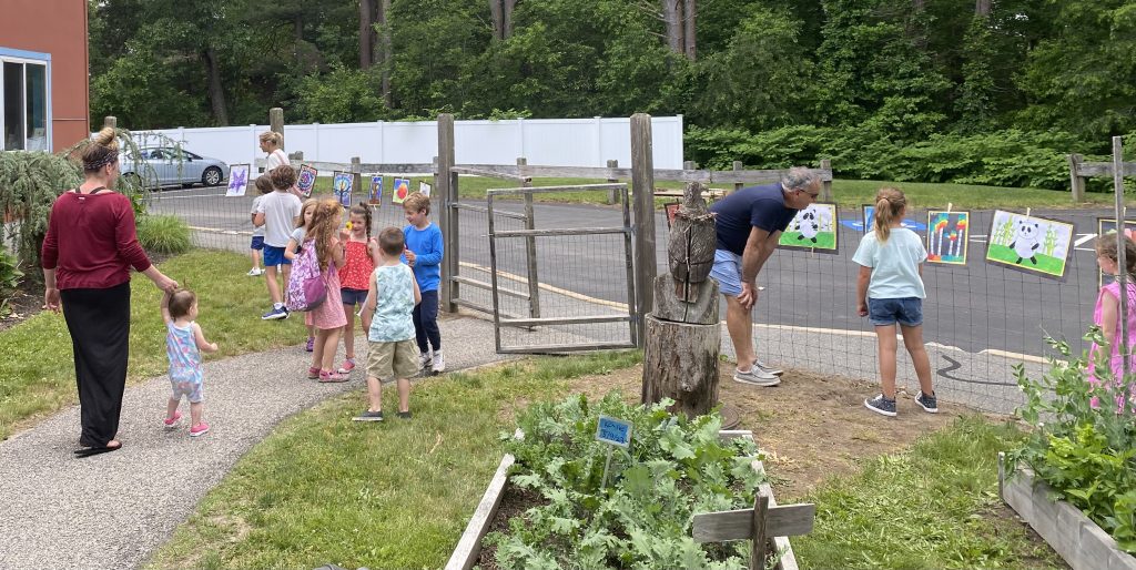 It was a perfect early June day in the garden at Old Colony Montessori School. Among the verdant sprouts of garlic, potatoes, and milkweed hung spectacular works of art created by the students. Students and their families enjoyed strolling in the garden admiring the art and the beautiful day. The Art Show shared some of the projects that the students created throughout the year. Students explored creating animals, plants and even monsters using a wide variety of techniques and materials such as paints, pencils, crayons, and crepe paper. Using shapes such as circles and triangles the students created Plovers. Additionally, by utilizing different painting tools like cotton swabs, they created little dots to make beautiful Lilacs. The students also used their creativity and imaginations to design their own monsters, using different patterns and materials and creating a 3-D image that leapt from the paper. This was a terrific opportunity to use their knowledge of shapes and materials in an original project.