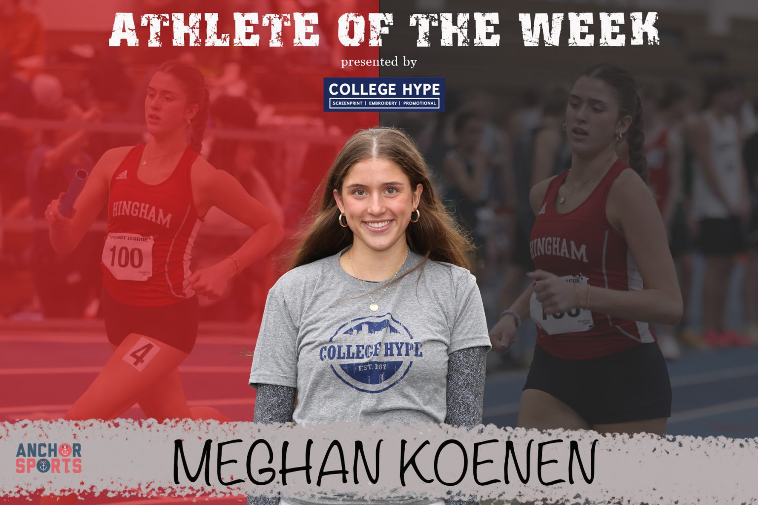 It was a busy nine days for this week’s Athlete of the Week presented by College Hype sophomore Meghan Koenen. Meghan particpated in three meets for Hingham’s Track and Field team, including a state championship relay meet. It started with a highly competative meet against rival Marshfield on 1/18 where she won the 600m with a personal best, won the shot put with a personal best and was part of the winning 4×400 relay team. In the state relay meet, she was part of the team that placed 3rd in the state. On Friday, she came in second in the 300m, won the shot put and was part of the winning 4×400 relay team again.