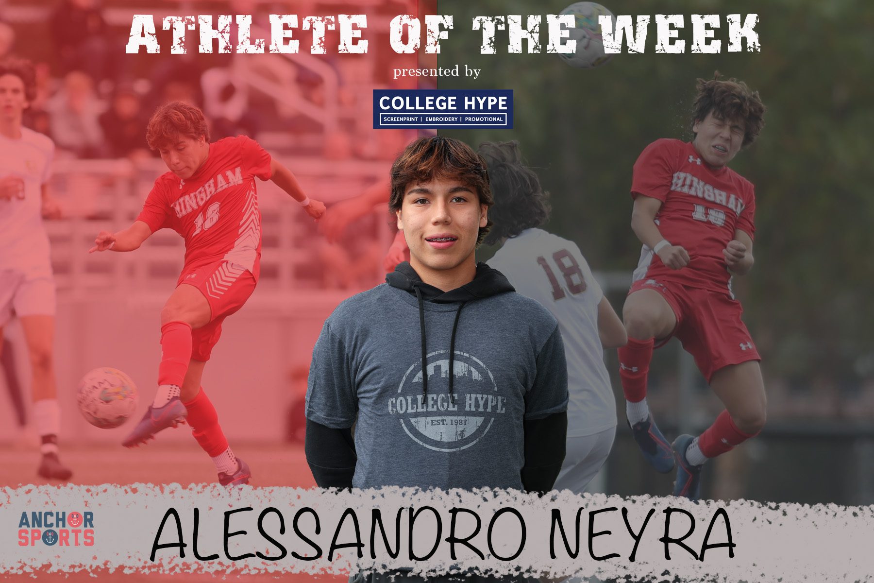 The Hingham boys soccer team is off to a 12-0 start after beating a very tough BC High team on Saturday. A large part to their success this season is due to the performance of this week’s Athlete of the Week presented by College Hype, Alessandro Neyra. The junior center midfielder has 10 goals in 12 games and a total of 16 points, which leads the Patriot League. He opened the scoring in two of Hingham’s games last week helping the Harbormen get the early leads in those games.