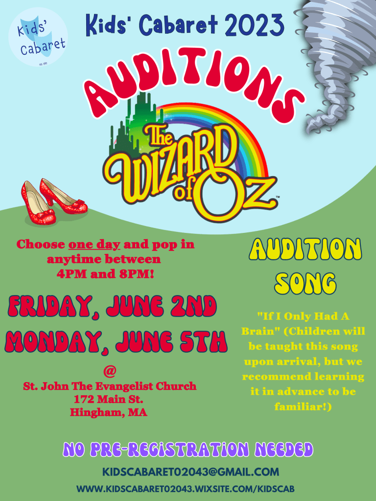Auditions will take place on Friday, June 2nd and Monday, June 5th, from 4pm to 8pm, at St. John’s Episcopal Church in Hingham. Kids are encouraged to attend only one of the audition dates. Any child within the age range is welcome to audition, and the audition song will be “If I Only Had a Brain”. While the song will be taught to all auditionees on site, Kids’ Cabaret staff recommends that kids familiarize themselves with the song beforehand to feel more comfortable. A practice karaoke track can be found here: https://youtu.be/0GyVCMKG5bI
