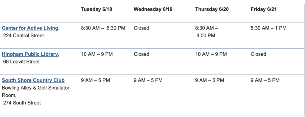 Residents can seek relief from the heat at the following Town facilities: