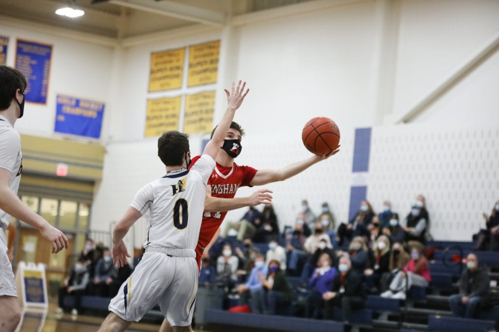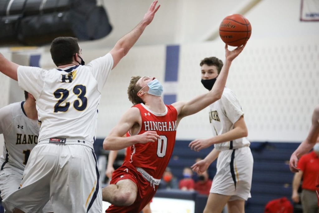 Senior captain Jack Hurley soars through the lane to tip in a rebound help to secure the victory for Hingham.