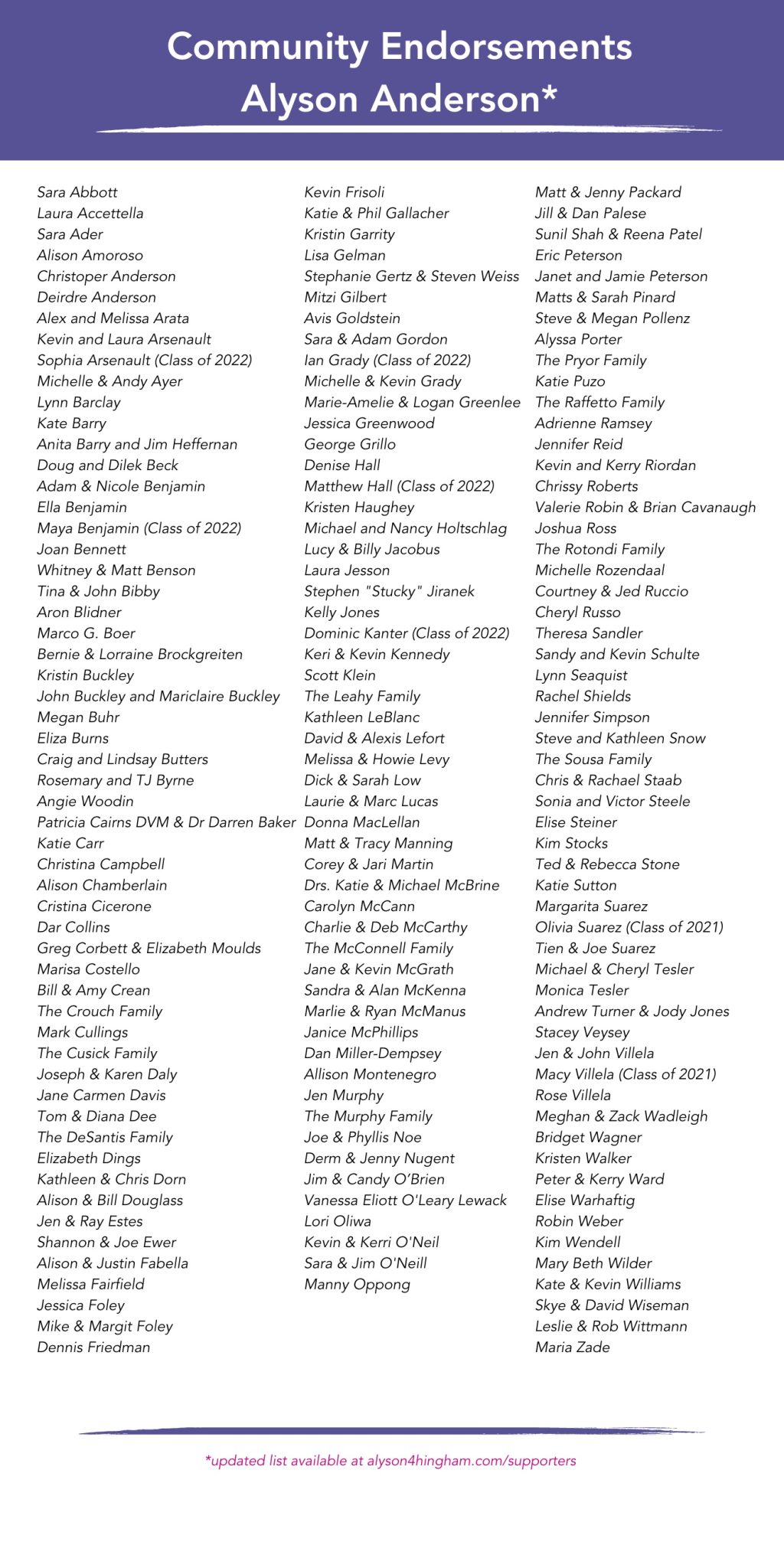 It’s nice to meet you! I am Alyson Anderson, candidate for the Hingham School Committee. I love this beautiful town we call home and would be honored to have the chance to help our schools move forward.