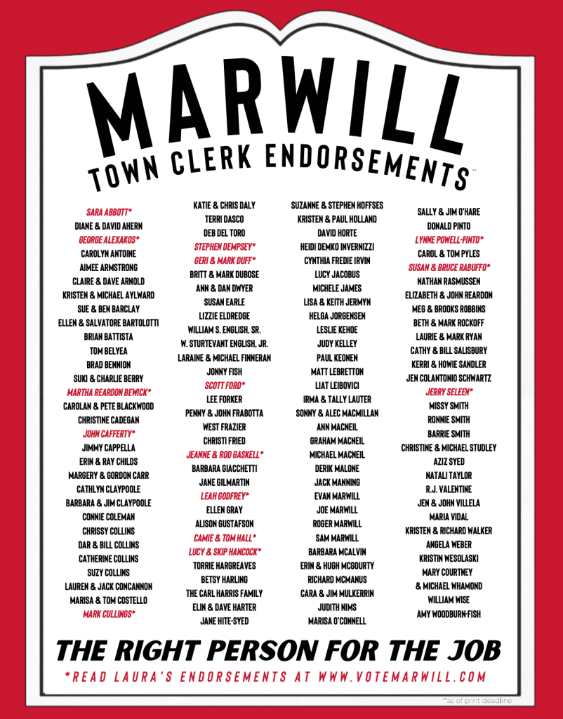 You are invited to support my campaign at standouts, hosting a lawn sign, or make a donation. Please visit www.votemarwill.com for more information, or Facebook (Laura Marwill for Hingham Town Clerk) and Instagram (@votemarwill). I also welcome the opportunity to connect with you directly. Message me to attend an upcoming Marwill Meet-Up at votemarwill@gmail.com.