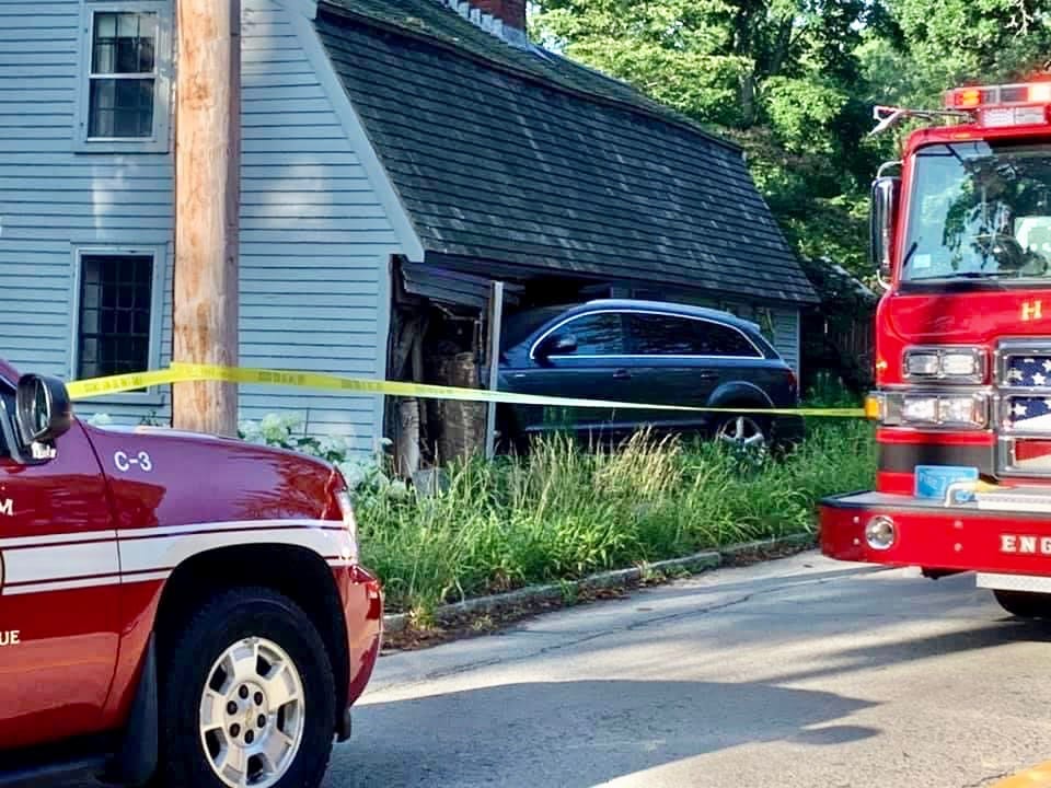 The car, a 2014 Audi Q7, had been traveling east on North Street from Beal Street. The driver said she swerved to avoid a squirrel in the road and drove off the right side of the street, over the sidewalk, and into the front of the house. Approximately half of the car entered the home. The driver, a 19-year-old Hingham woman, was alone in the car. She was issued a citation for failing to stay in marked lanes.