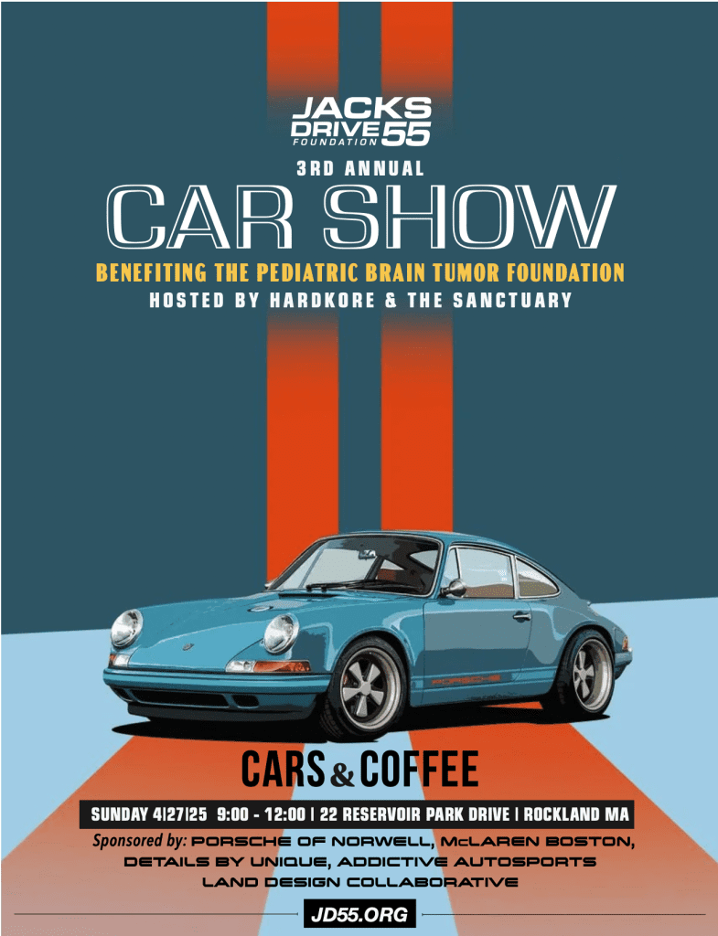 Jacks Drive 55 Foundation (JD55) is hosting a free Cars & Coffee show on Sunday, April 27th from 9:00 AM to Noon, hosted by Hardkore Athletic Performance Center, located at 22 Reservoir Park Drive, in Rockland. The Show will feature a variety of sports cars and antiques supported by local collectors as well as Mclaren Boston and Porsche Norwell. All the proceeds from the event will benefit The Pediatric Brain Tumor Foundation.