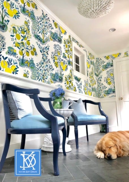 Choosing my favorite room in town is a tough one! I work to create an experience for my Clients that celebrates their individuality. When we built our home’s new entry way, I looked at it the same way. I have this thing with wallpaper. And color. And on the dreariest New England day, this room makes me happy. Most importantly, I love this room because it is the entry into our home. It is where our family starts and ends their day. It is where we welcome friends and family. And it is where our Golden, Osborne, meets us with the most genuine and loving greeting every time we come home.