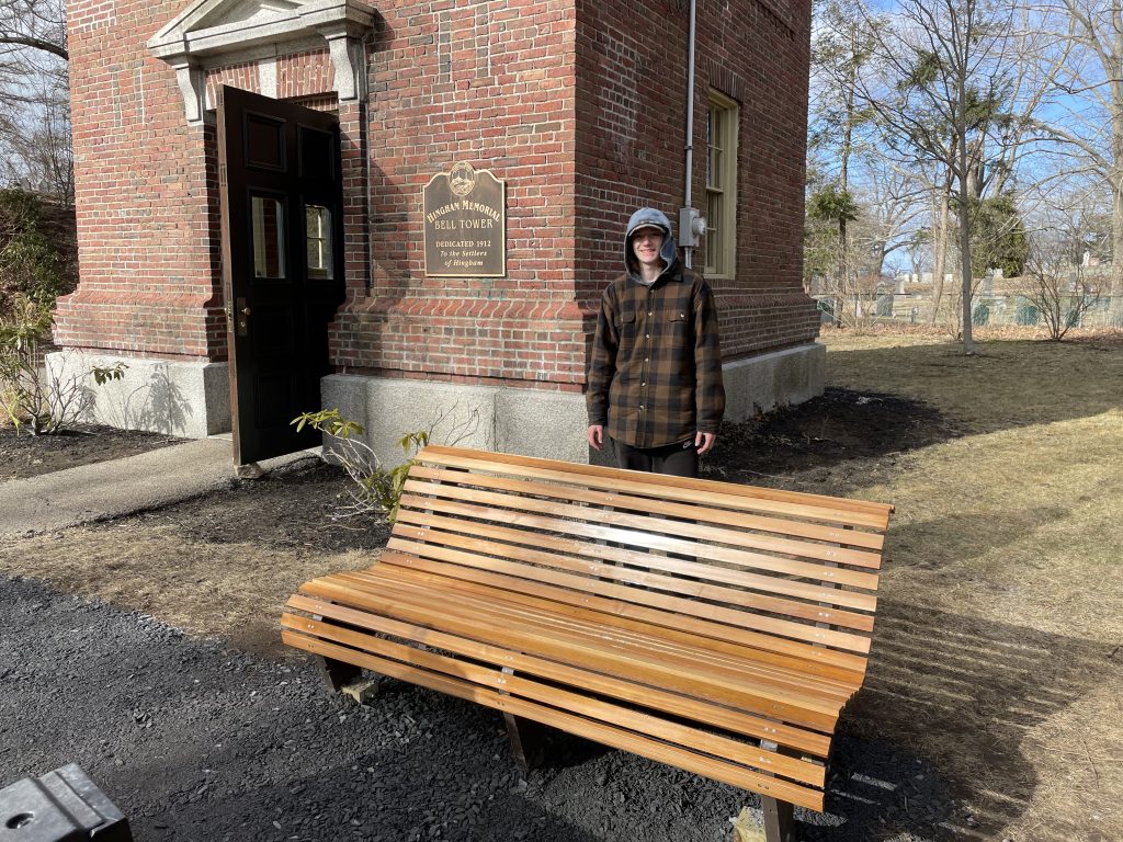 The Hingham Memorial Bell Tower has been the beneficiary of a beautiful bench that was the Eagle Scout project of Michael Wegener. As stated by Michael, “As part of my Eagle project I built a fully natural wooden bench near Hingham’s historical bell tower. I chose this location over many others because Hingham’s bell tower is over one hundred years old making it one of Hinham’s most prized buildings. I have noticed many people come to listen to the bells or stop by on their walks to listen to the ringers ring their methods. Especially when ringers from Europe come to the U.S to ring, lots of people come from all over to listen to the bells. The bell tower is conveniently placed in Hingham Square right next to Old Ship Church, so the bells can be heard and attract people all over downtown. I thought that a bench that the community can peacefully sit in and listen to the bells on or just to rest on a walk or run would be a nice addition to the bell tower.”