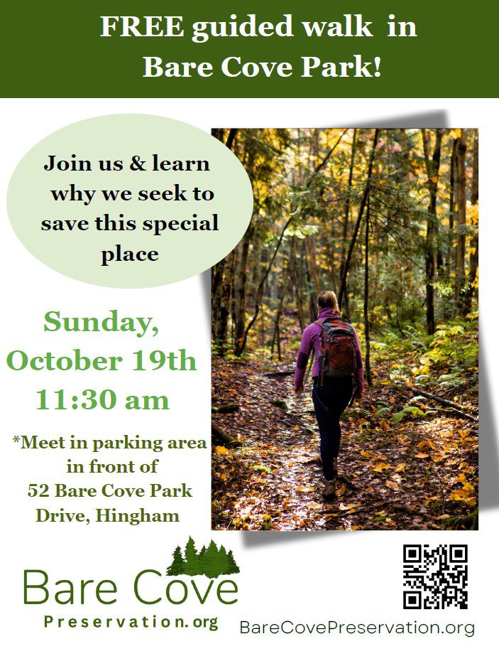 We are inviting the public to join us for a community walk through Bare Cove Park. Meet at parking area at 52 Bare Cove Park Drive, Hingham, MA 02043.