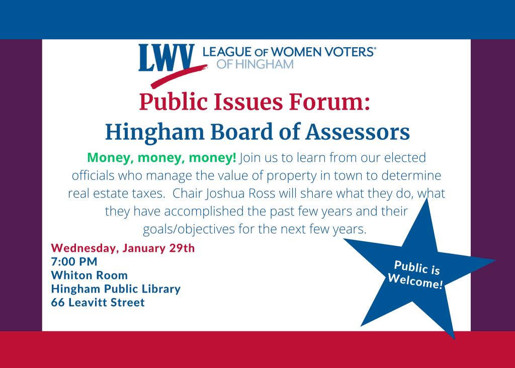 The LWV Hingham invites the public to join our members to learn from our elected officials who manage the value of property in town to determine real estate taxes. Board of Assessors Chair Joshua Ross will share what they do, what they have accomplished the past few years and their goals/objectives for the next few years.