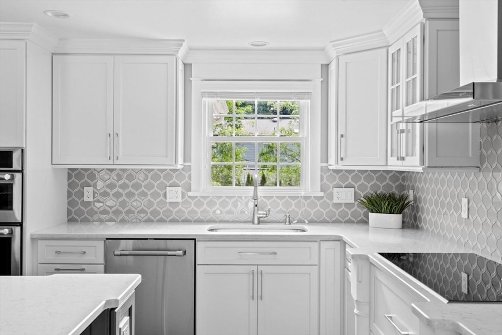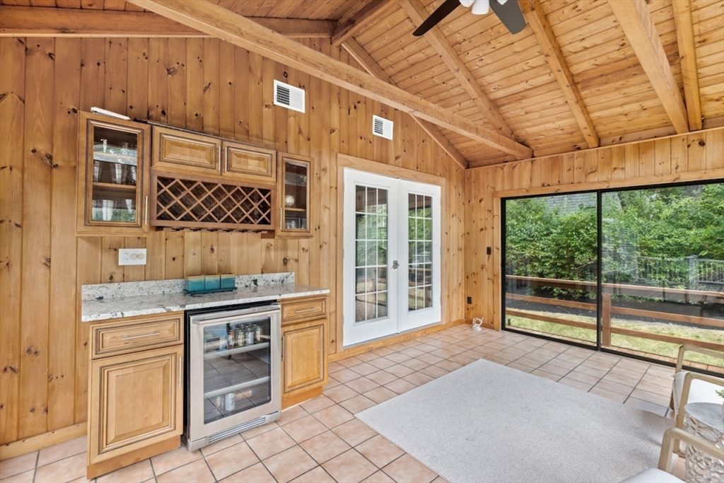 Enjoy the custom-built-ins in the living room and bask in the natural light flooding the sunroom, which features a stylish bar area leading to an enormous deck offering a serene view of the picturesque backyard, ideal for outdoor entertaining.