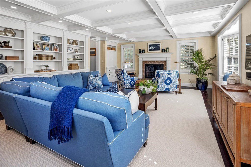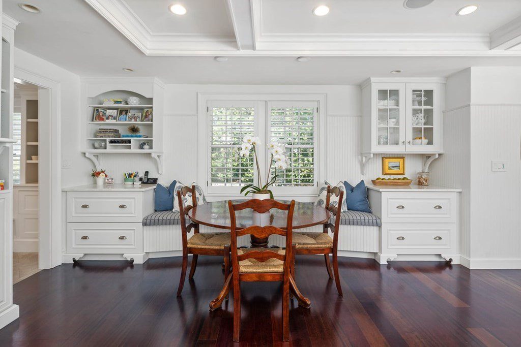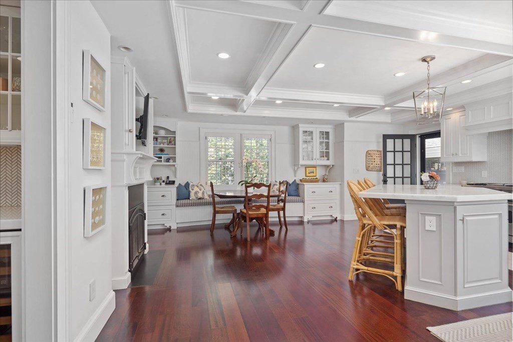 The kitchen is beautiful, with a large island, coffered ceiling, built-in banquette, butlers pantry and fireplace.