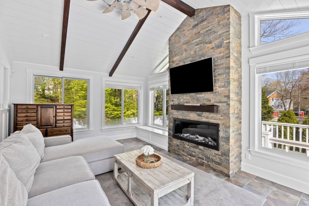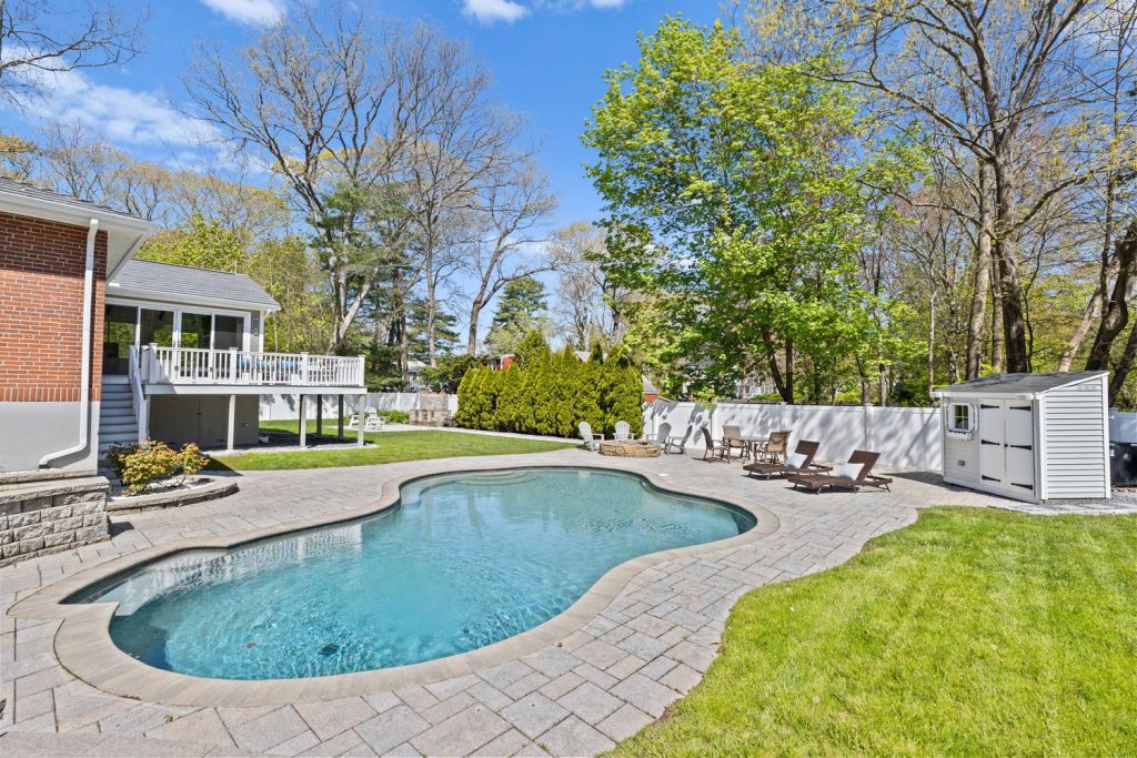 The private backyard is a true oasis featuring an inground gunite pool, stunning hardscape, outdoor fire pit, and fireplace. The property also boasts a 4-bedroom septic system.