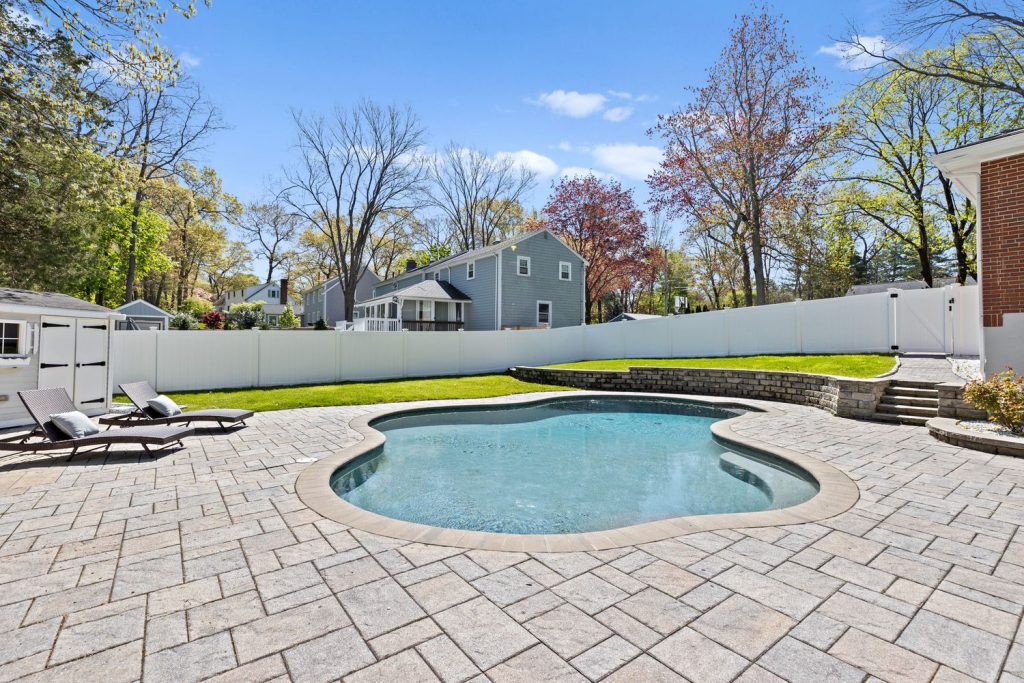 The private backyard is a true oasis featuring an inground gunite pool, stunning hardscape, outdoor fire pit, and fireplace. The property also boasts a 4-bedroom septic system.